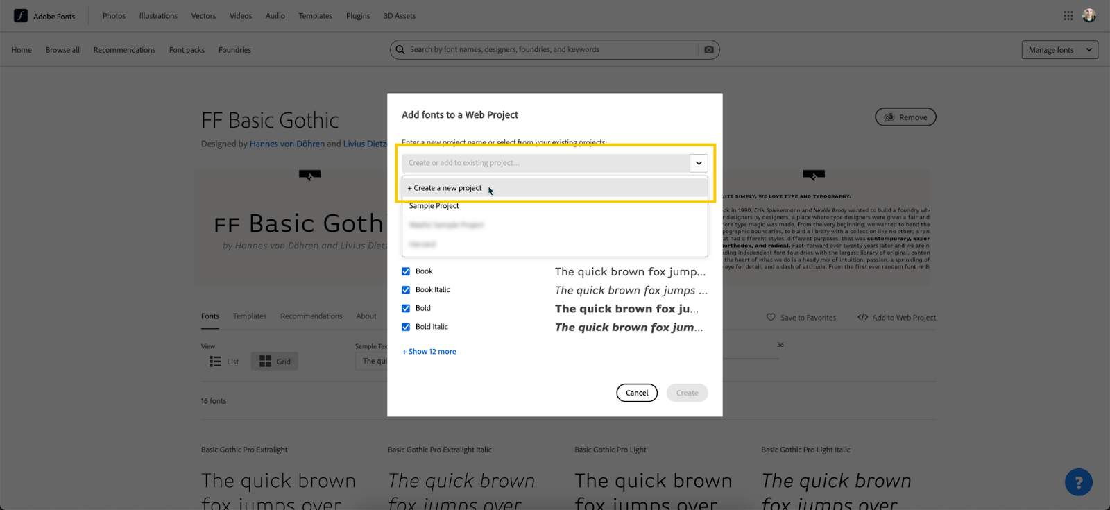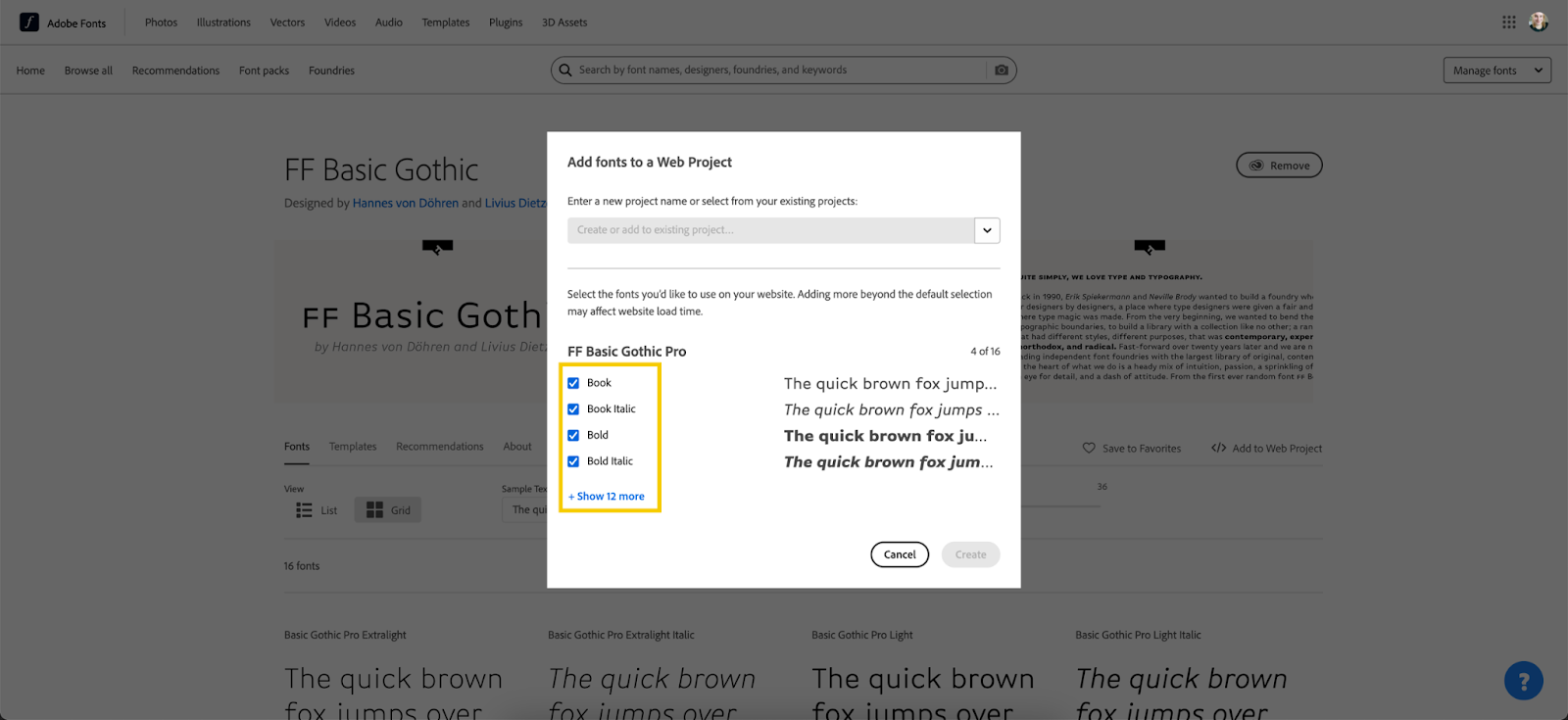 Search for and select the font family you want to use (example: FF Basic Gothic).