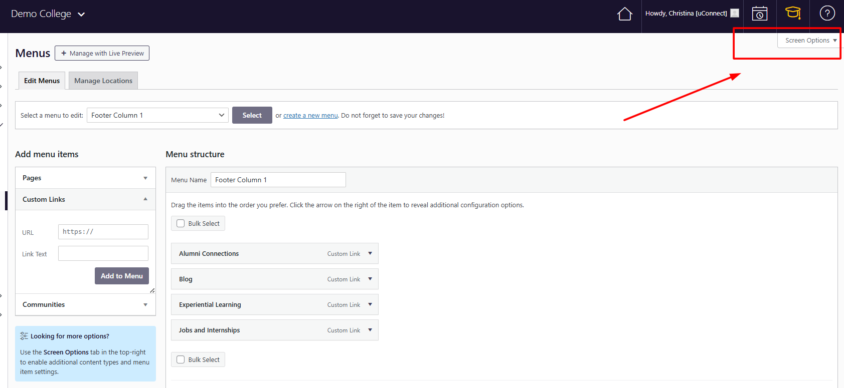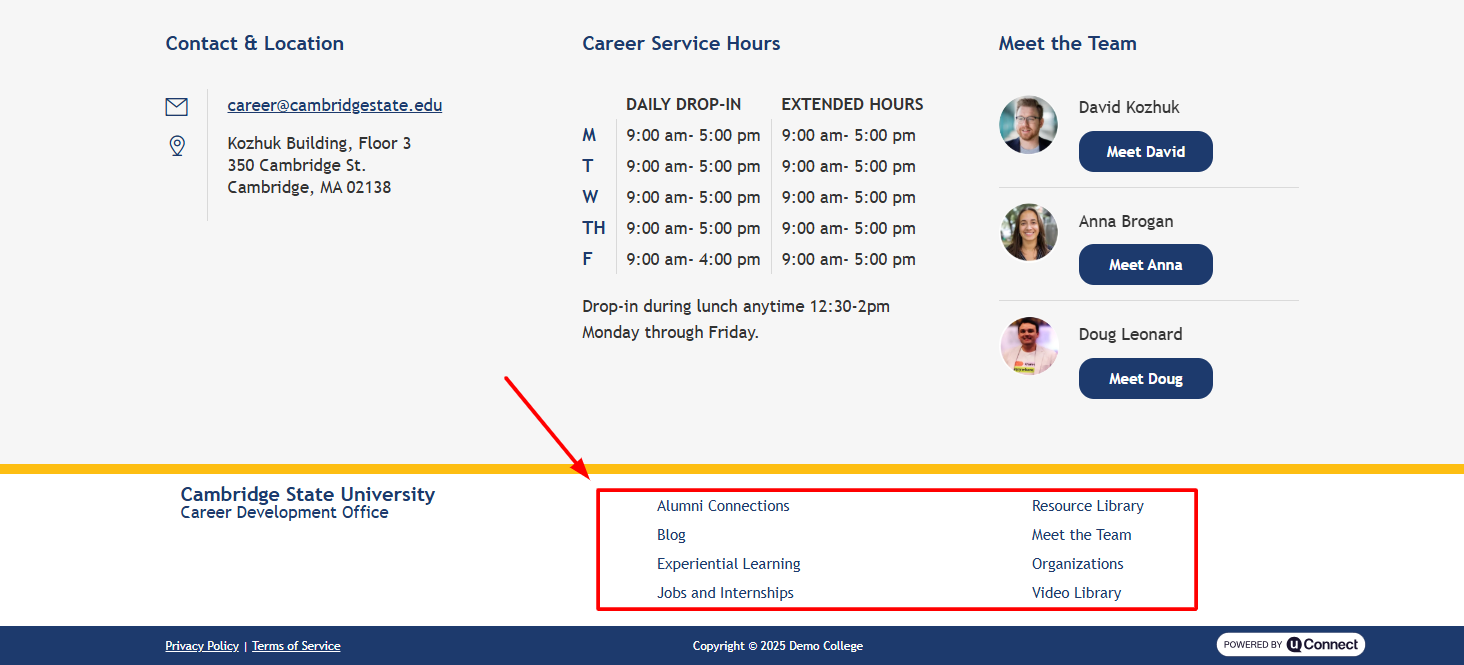 Footer menus appear at the bottom of your platform and often include institutional resources, quick links, or student services. Most institutions have at least two footer menus (often labeled Footer Column 1 and Footer Column 2), but you can add more if needed. These menus are fully customizable unless your marketing or communications team has specific branding requirements.