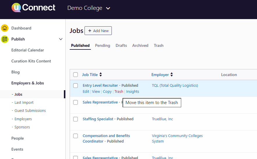 When you connect uConnect to job sources like Handshake, Symplicity, or 12Twenty, jobs and events can flow in automatically. That’s powerful, but it can also create challenges: