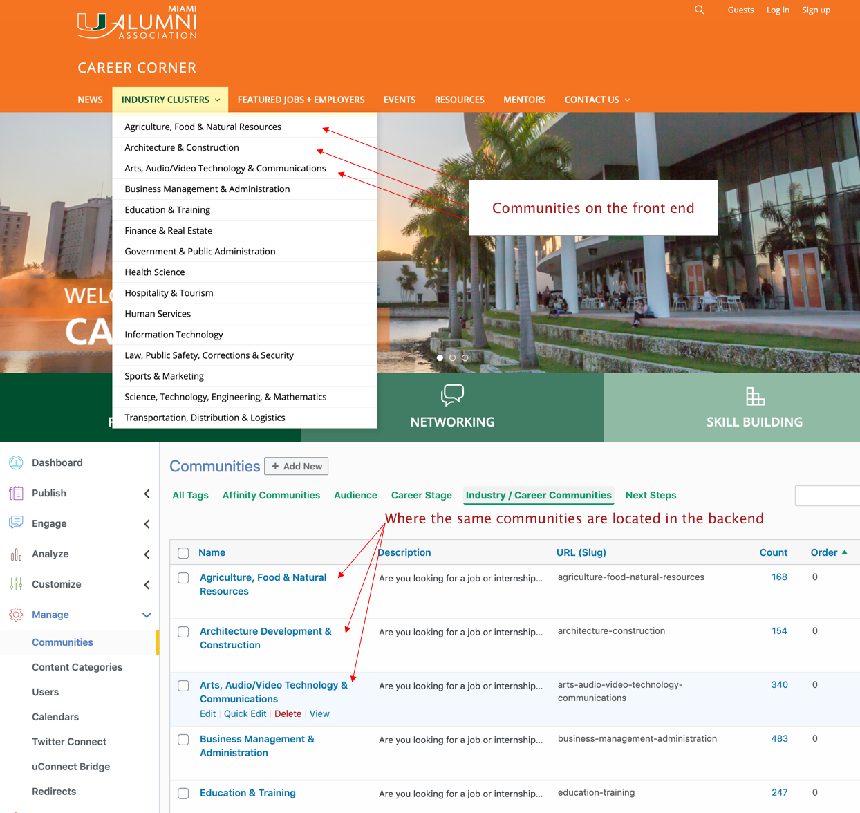 In your admin dashboard, you can add and edit Communities on the front-end of your site by editing the corresponding Community page in the dashboard.