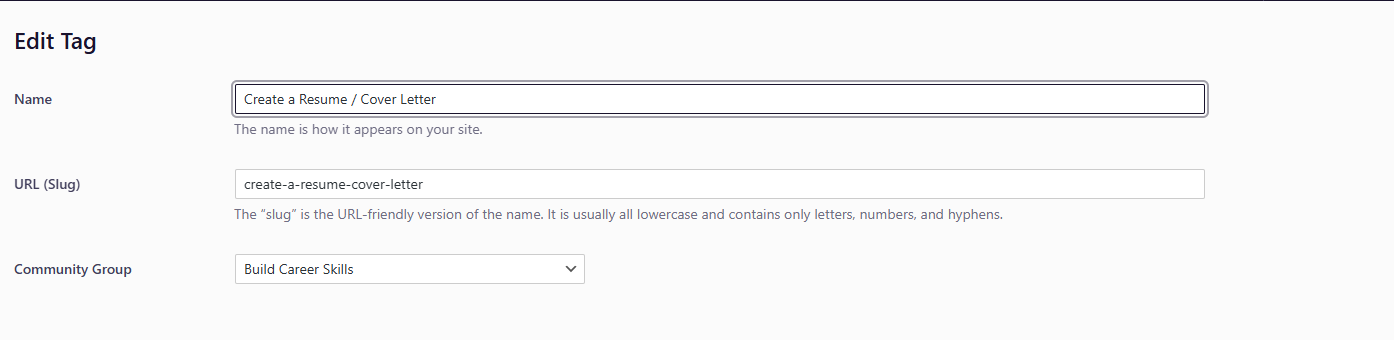 Reminder: Communities are categorized as a part of Community groups, such as "Build Career Skills" or "Career Communities" or "People We Serve." Within each Community group, there are sub-communities, such as within "Build Career Skills" there might be "Create a Resume" or "Prepare for an Interview." Keep this in mind as you organize your Community pages!