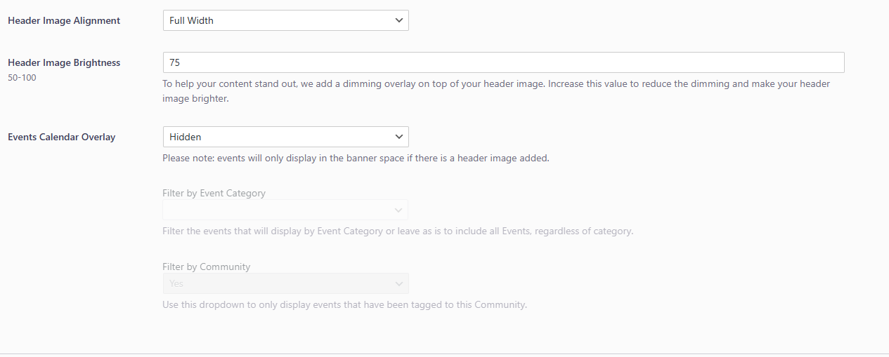 Then, you'll see an Events Calendar Overlay section. This is how you can enable Events to display on top of your header image and you can also have these events only display if they have been tagged to the Community page you are editing, as well as specific Event Content Categories too.