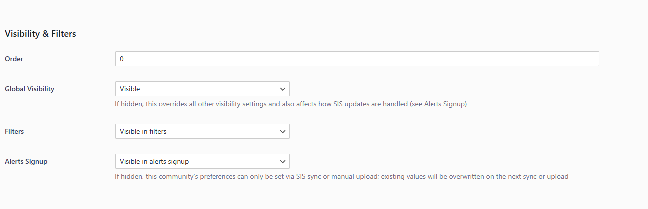 Then, "Global Visibility" allows you to hide the Community page entirely. If hidden, this overrides all other visibility settings and also affects how SIS updates are handled (see Alerts Signup). Use this with caution. This is most helpful to use when you are still building out a Community page and you are not yet ready to take it live.