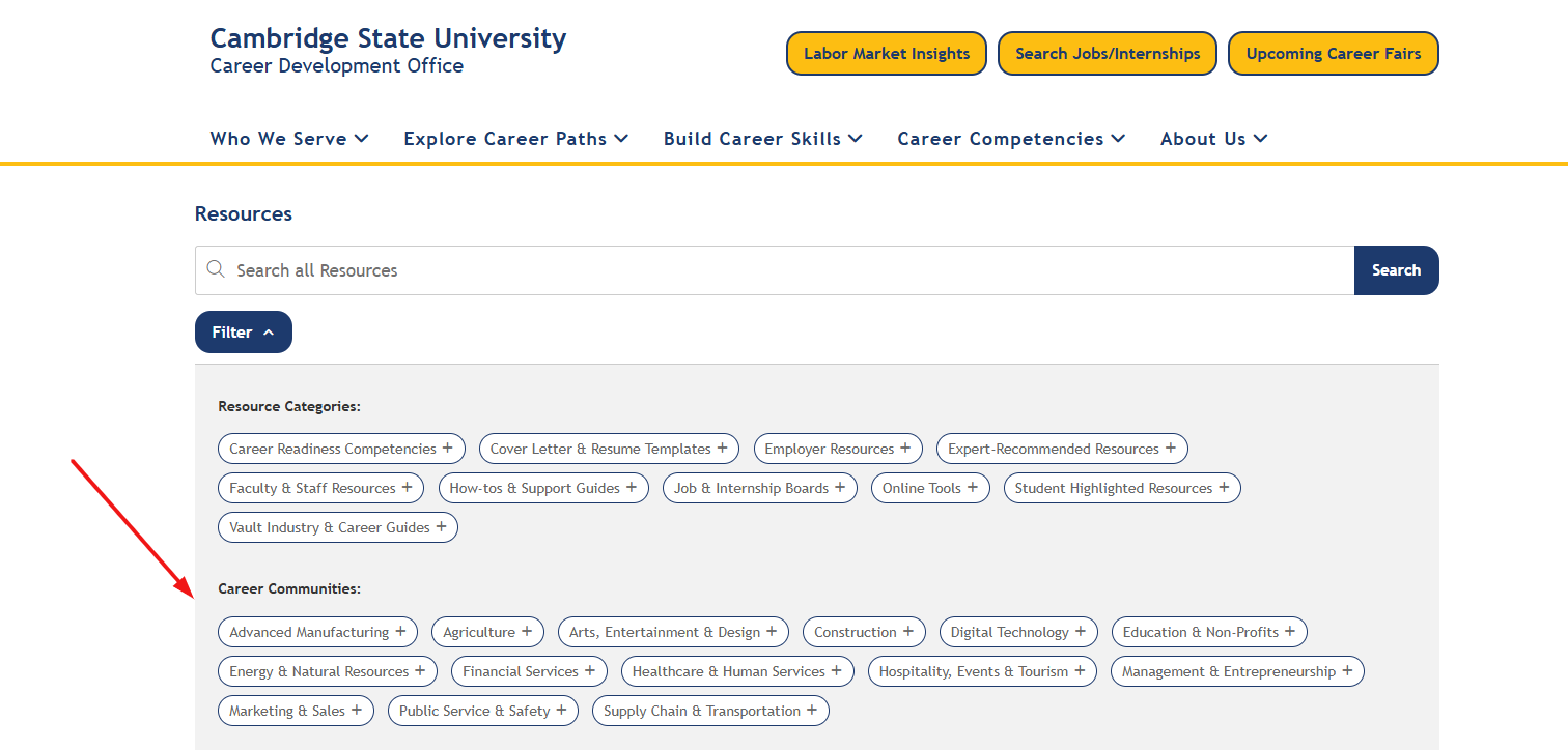 Next, the "Filters" dropdown allows you to hide this Community page from the various filters that your users can use to explore your content types. For example, if a student was exploring your Resources on your platform and you had all of your Career Communities filters set to "Visible," they'd be able to filter those resources by Career Community. The opposite would be true if you switched them all to "Hidden."