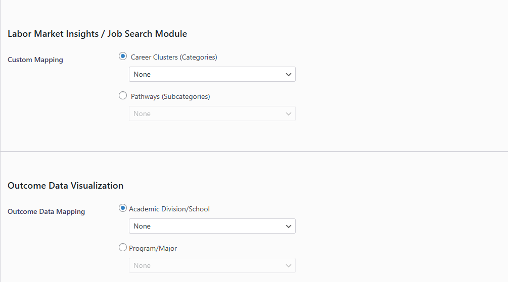 If you have Labor Market Insights and/or Outcomes Data Visualization enabled in your platform, these settings allow you to pre-filters the widgets to display either by Career Clusters (which are broader categories) or Pathways (which are more specific subcategories).