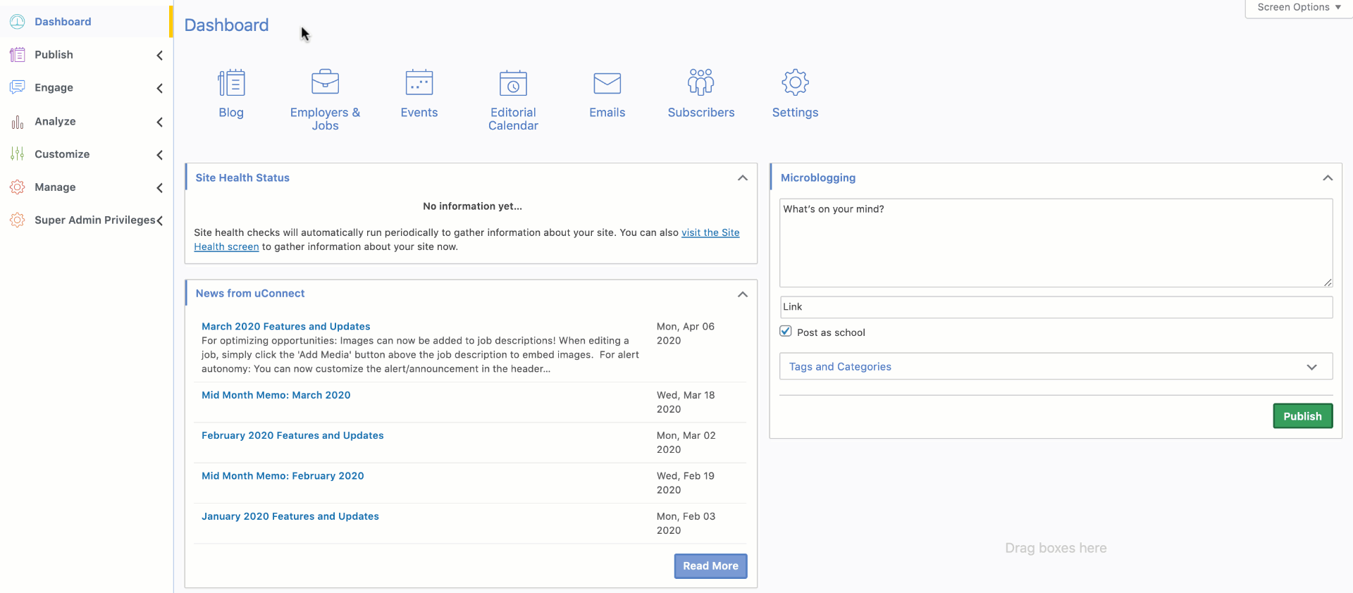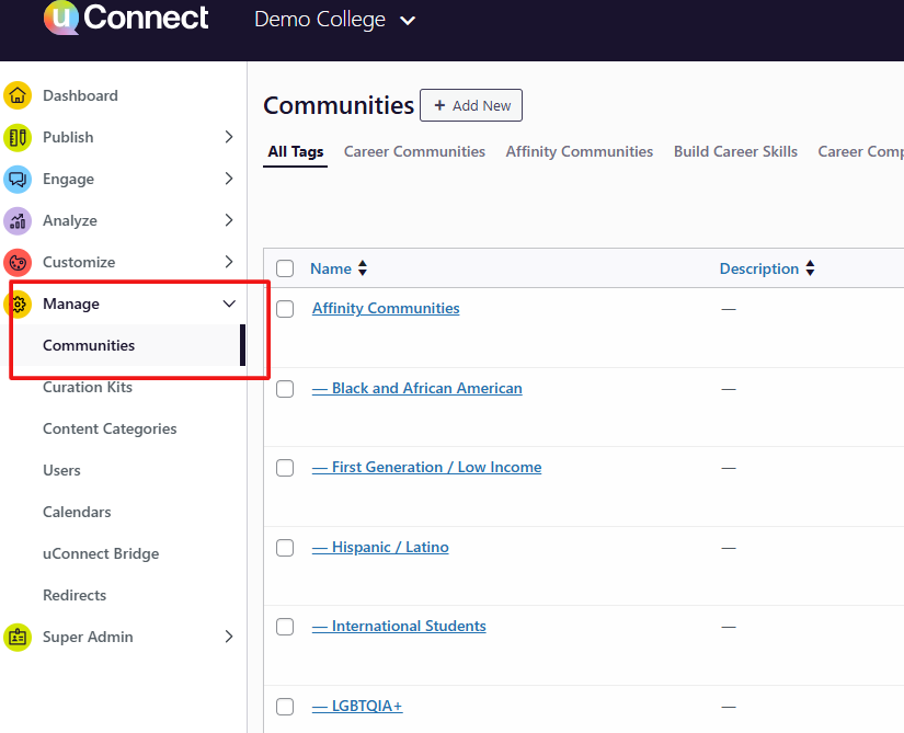 You can edit Community pages from the Manage section of your admin dashboard. There are many aspects of your Community pages that you can edit but it is mainly infrastructure-related, meaning you can edit the overall elements and structure of these pages but you cannot publish the uConnect content types from here (i.e. Blogs, Resources, Jobs, etc.) as that all happens in the Publish section. Learn more about all of the sections of settings available to you to edit your Community pages.