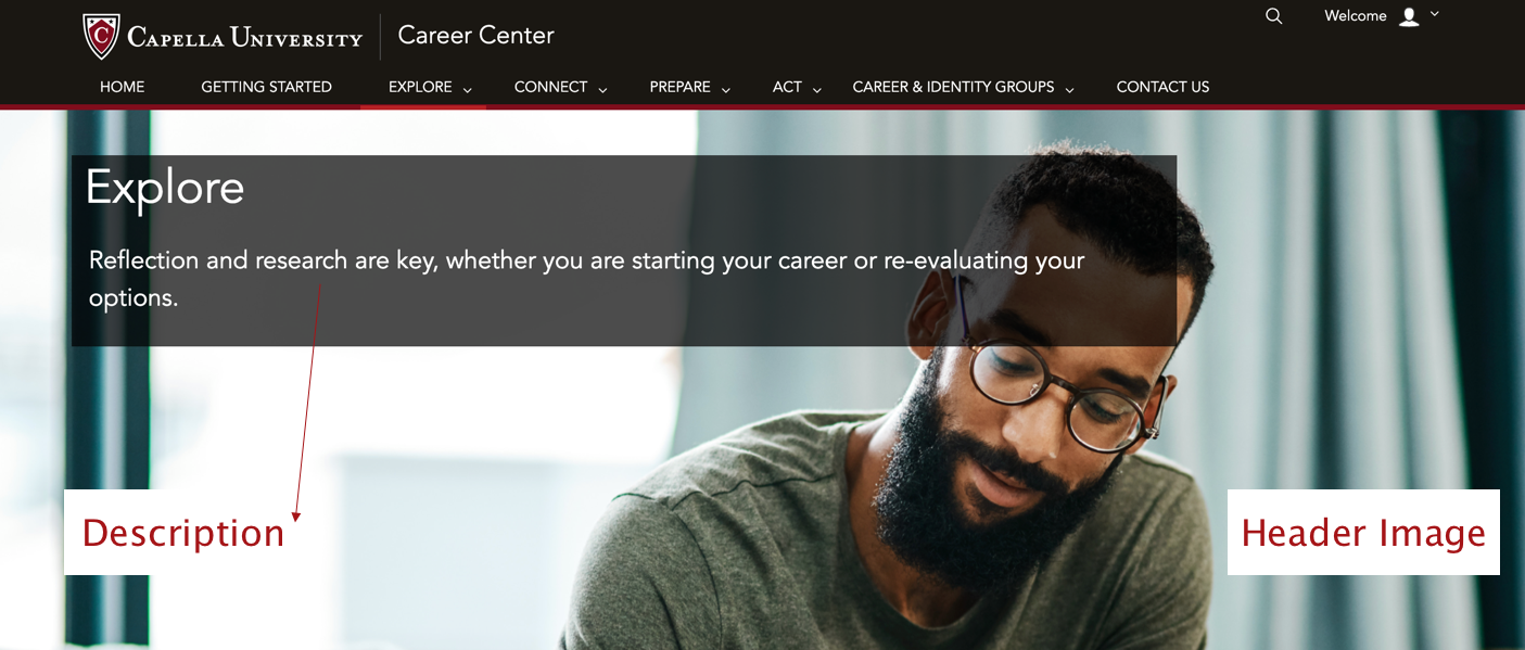 The picture below shows the header image and overlaid description from Capella University's Explore community.