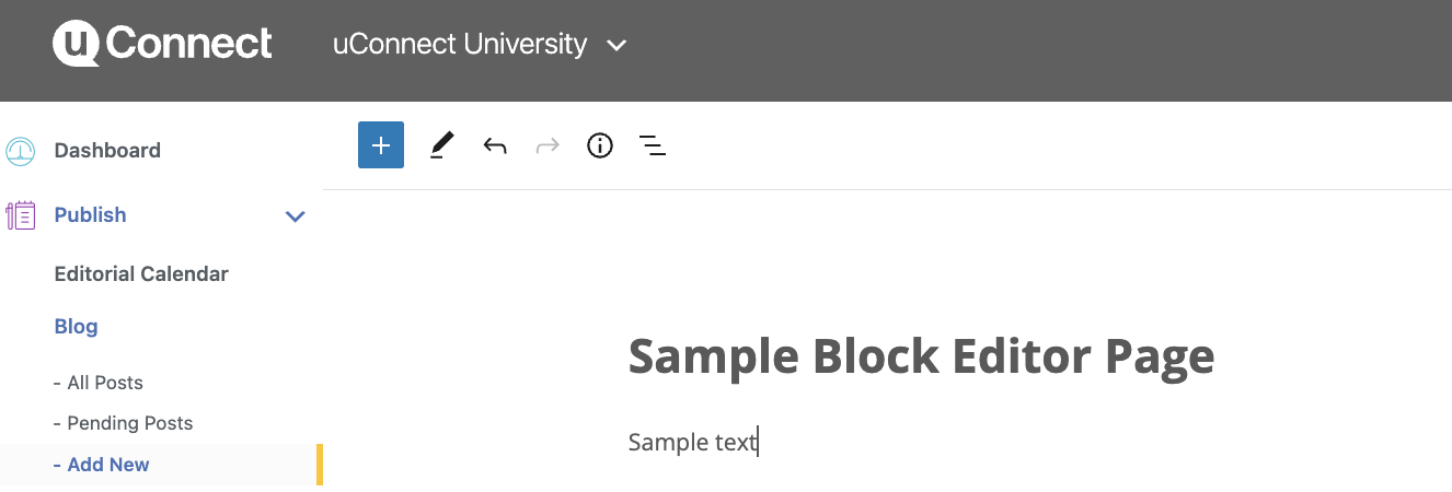The key differences you may notice above are that there's no longer a text/visual tab, and you now have a blue plus sign in the top left as you're editing content on the block editor.