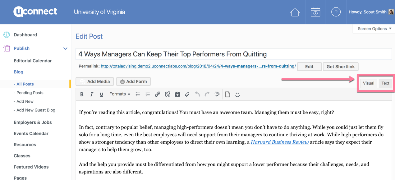 If you notice that your screen looks different as you're editing a blog post, custom page, resource, or Community static content, you're likely on the latest version of the editor, called the block editor! You'll find an example of what this looks like below: