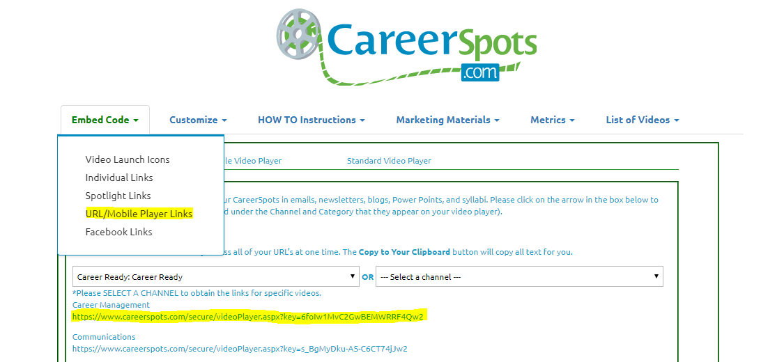 In CareerSpots, find the video you wish to embed. Select and copy the link from the 'URL/Mobile Player Links' section