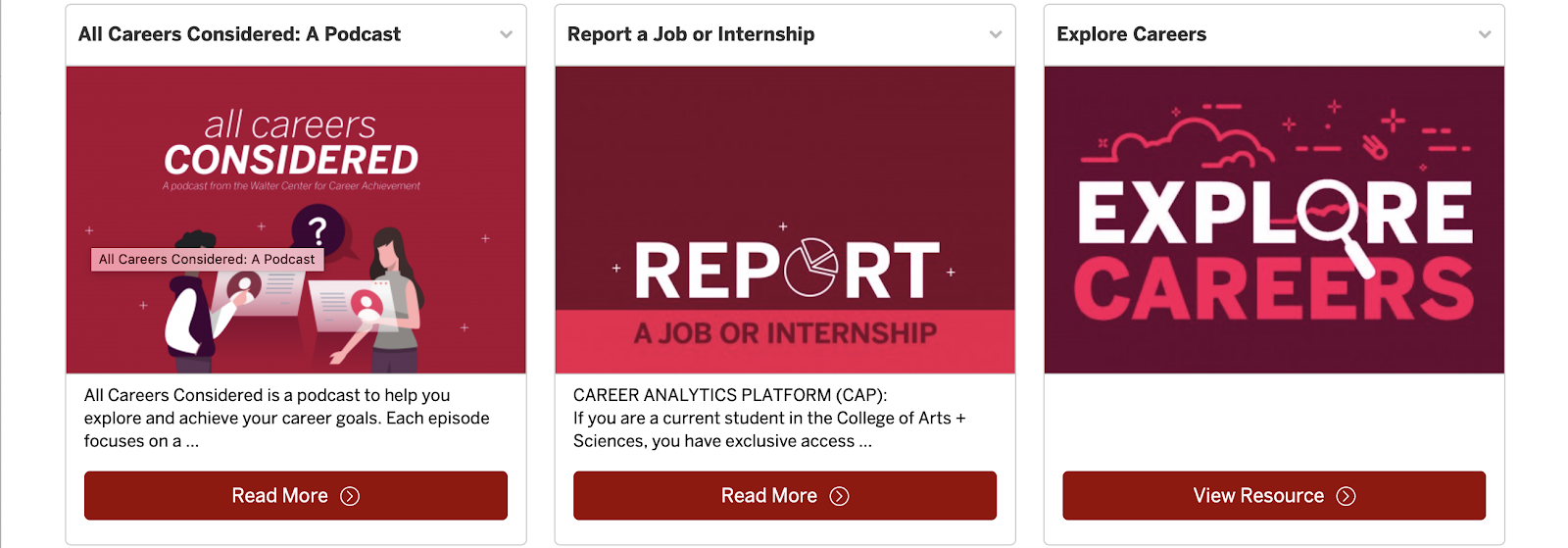Some common featured images include text, students, laptops, books, or buildings with your college or university’s official color as an overlay, to maintain a similar theme. Below is an example of how Indiana University College of Arts and Sciences has branded their resource library.