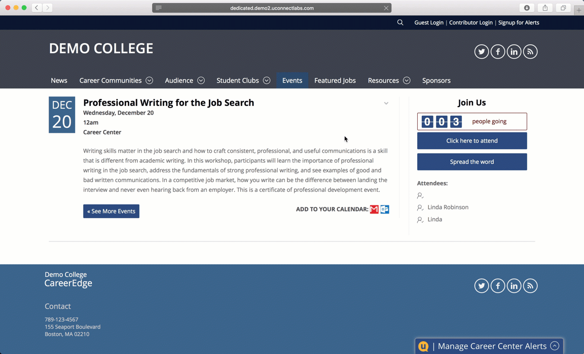To enable internal RSVPs, select the Internal RSVP button. To RSVP through the internal system, attendees are required to input their contact information. You have the option to show a list of confirmed attendees right on the page, or to display only the number of confirmed attendees without names.