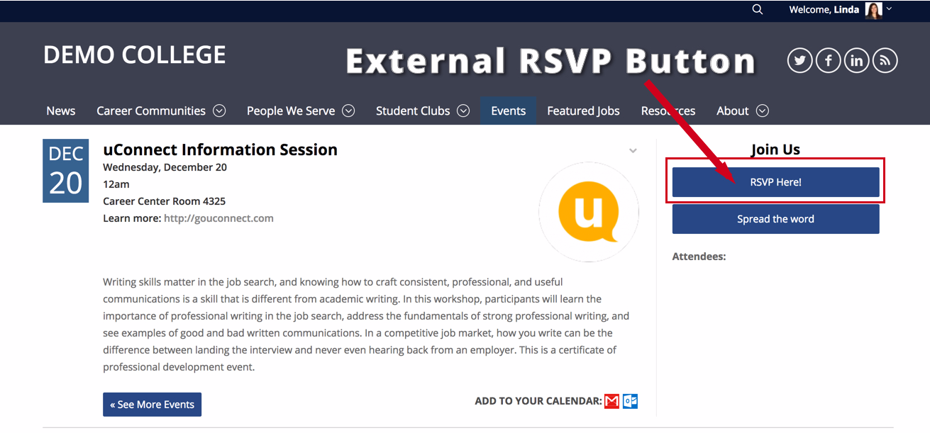 To enable an external RSVP, select the External RSVP button. This will generate a button on the event page that redirects students (or other site visitors) to the same event listing within your CSM.