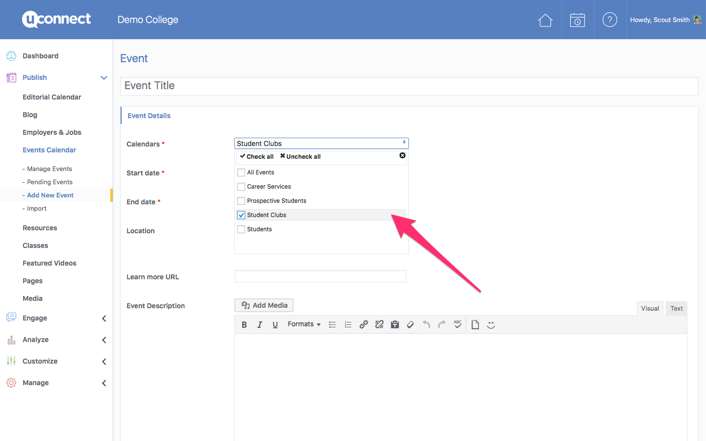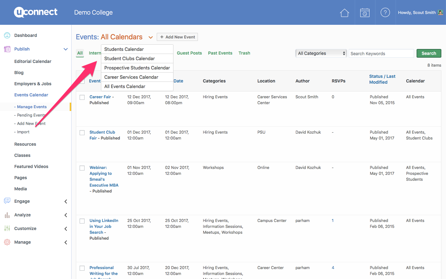 As an admin, you can log into your uConnect dashboard to organize events for a particular calendar using the Categories link in the Events Management menu. If multiple audiences begin looking at the same calendar, managing categories can become difficult. Creating unique calendars for each audience group is a great way to help your stakeholders stay organized and engaged.