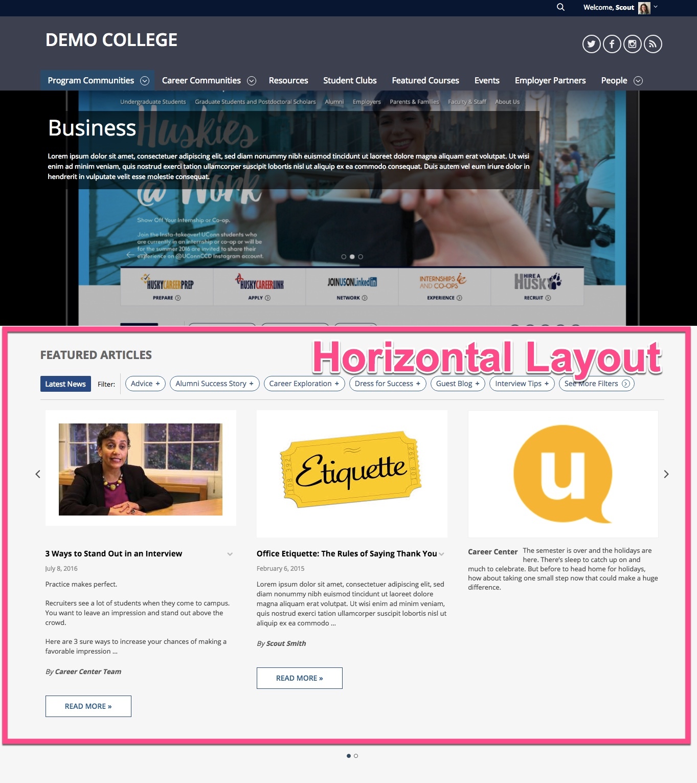Dynamic feeds are a default section for communities, where a feed of blogs, resources, and/or videos that have been tagged to a specific Community can be presented at the top of the Community in either a horizontal or vertical layout. Dynamic feeds are perfect for displaying your content in real-time as it's published.
