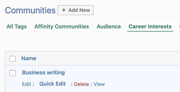 Note: Deleting a Community will not delete the content (blog posts, events, jobs, resources) that has been tagged to it. However, if you unintentionally delete a Community and then re-create it, the content will not automatically re-attach to that Community--you'll need to re-tag all of the content that was previously tied to it. Subscribers that have been tagged to a Community will also no longer be tagged to a Community if it has been removed.