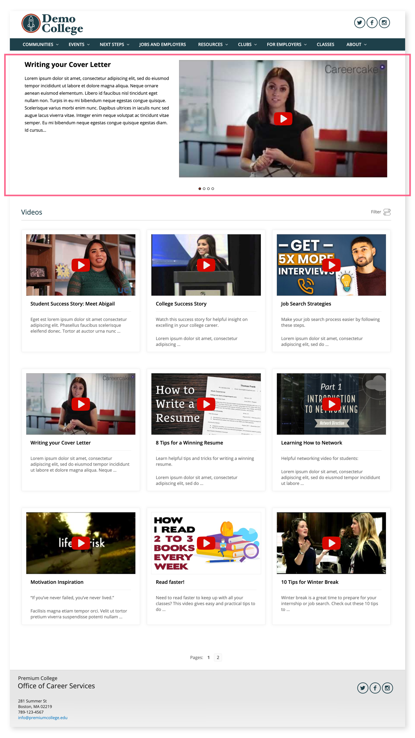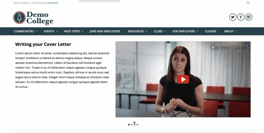 If more than one video is designated as a hero video, the hero space will act as a carousel, where users can cycle through the hero videos. There is no limit to the amount of videos you can add to the hero section.
