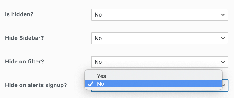 Scroll down to the bottom of the Community’s page, and select “Yes” or “No” in the “Is Hidden?,” “Hide Sidebar?,” “Hide on Filter?,” or “Hide on alerts signup?” options shown below.