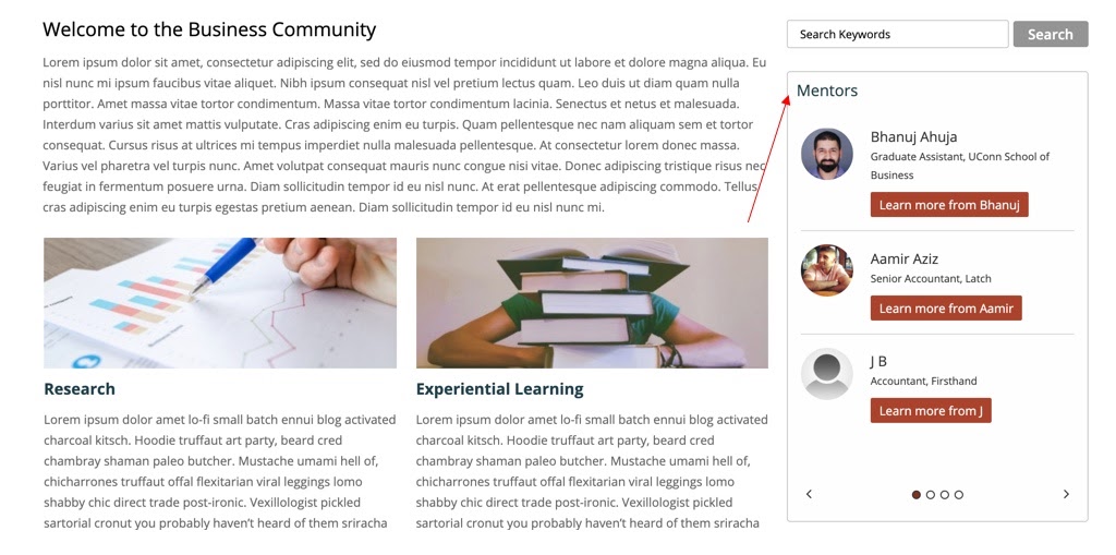 In addition to hiding Communities from both the tagging and filters sections, admin can remove Community sidebars, leaving only any description included at the top of a Community, followed by horizontal widgets added to the page. Selecting “Yes” on the “Hide Sidebar?” option removes all sidebar widgets, or vertical content types feeding into the right hand side of a Community and dynamically pulling in content tagged to that particular Community.