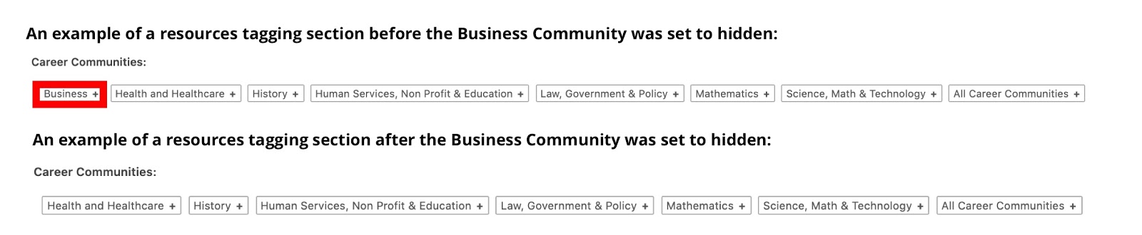 Once “Yes” is selected from the “Is Hidden” field, whenever users tag content, including resources, blogs, jobs events, etc., the Community set to hidden will not appear as an option during the tagging process. For example, if an admin hides the Business Career Community, and is publishing a new resource or additional content type, under the “Career Communities” tagging section, users will no longer see Business as an option they can assign content to.