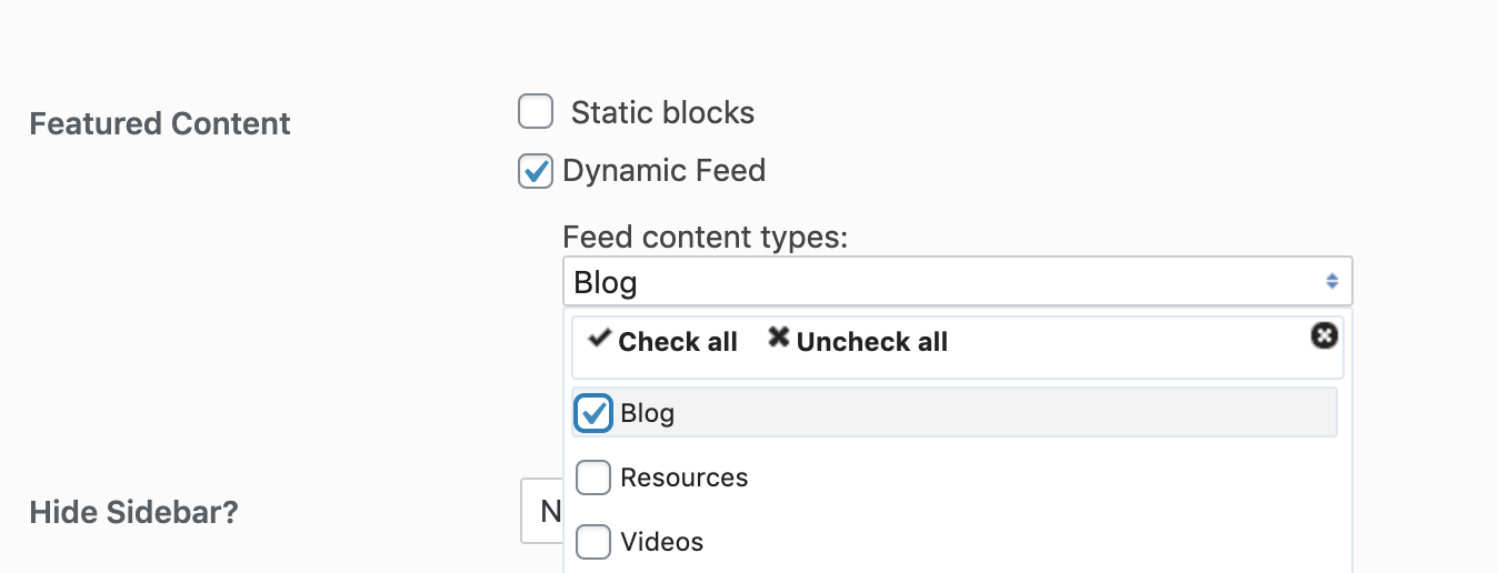 The default option for the dynamic feed is blogs, but resources and videos can also be checked off to pull in.
