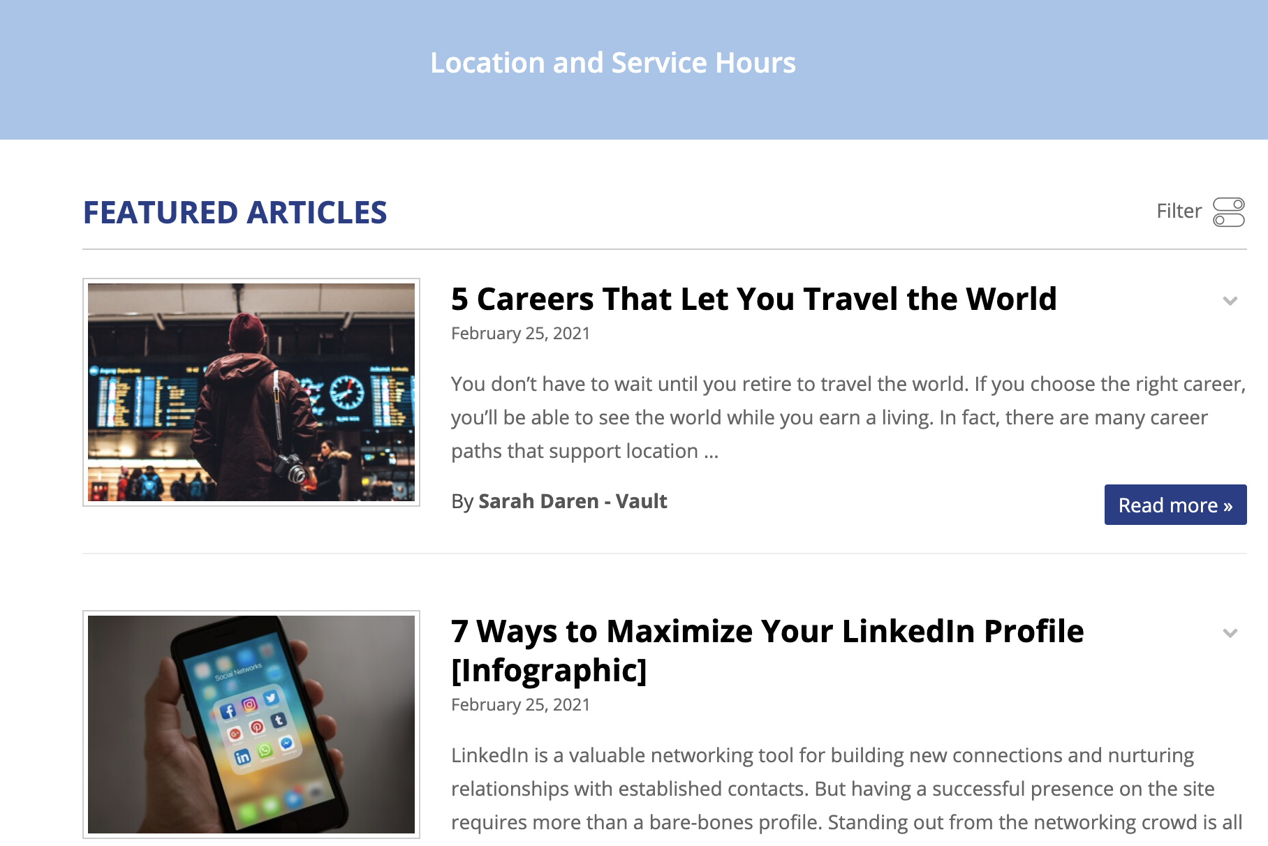 Having 'dynamic feed' selected allows for any content type checked off in this section (blogs, resources, or videos) to appear at the top of all Community pages when a piece of content is tagged to appear on that page. For example, if a blog titled '5 Careers that Let You Travel the World' is tagged to the 'Arts and Communication' Community, and 'Blog' is checked off in the dynamic feed section, this article will pull into the top of the Arts Community, as shown below: