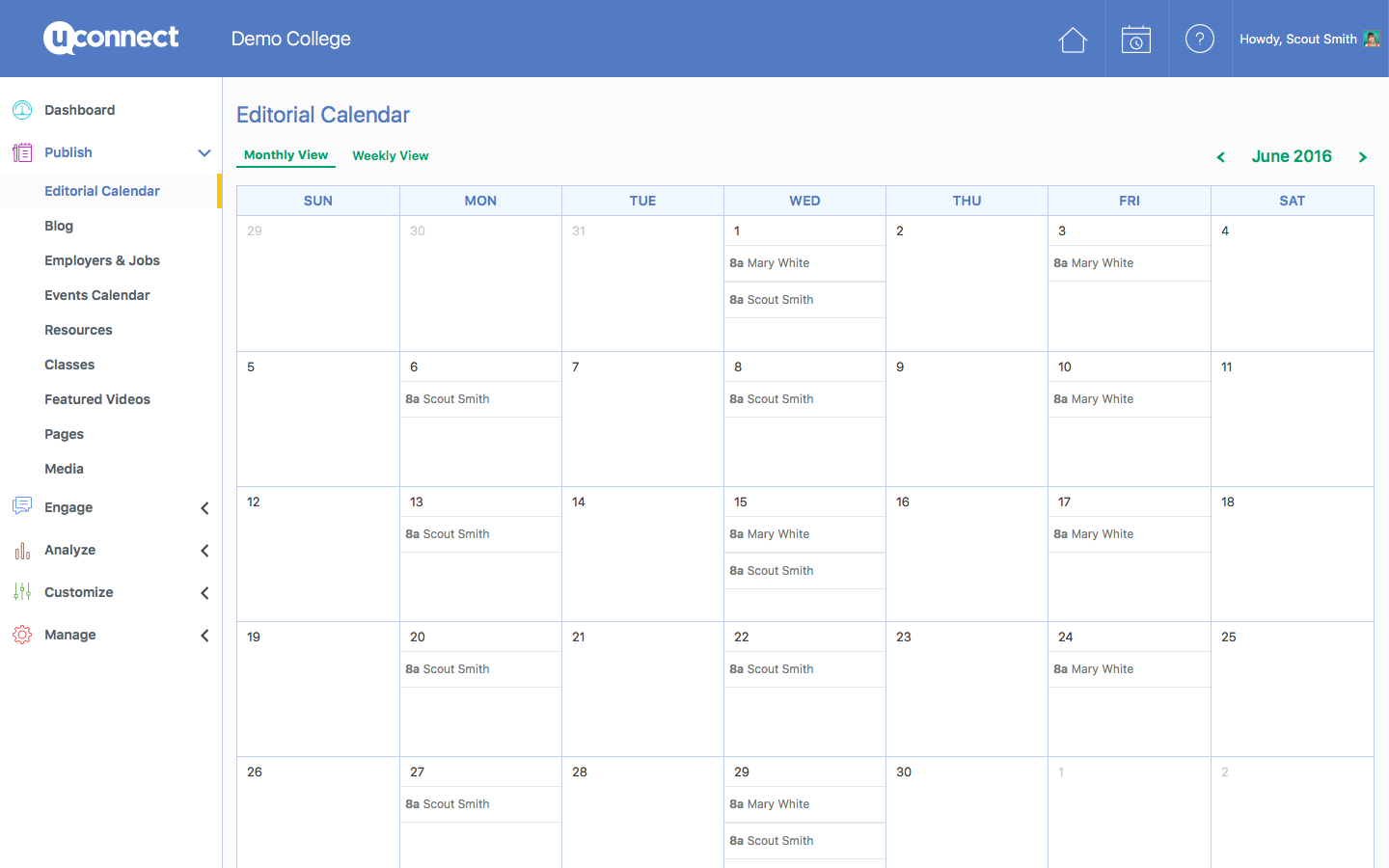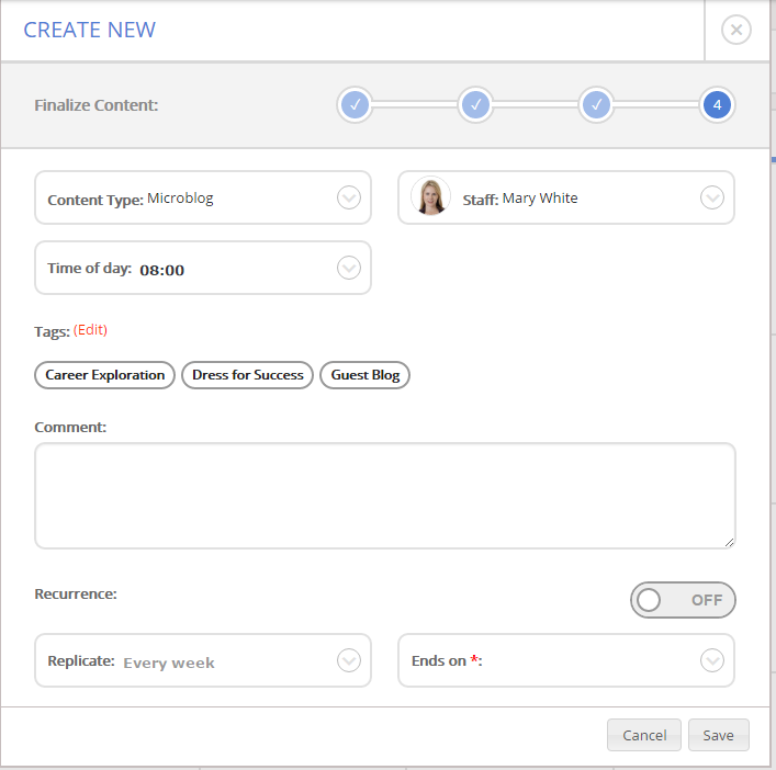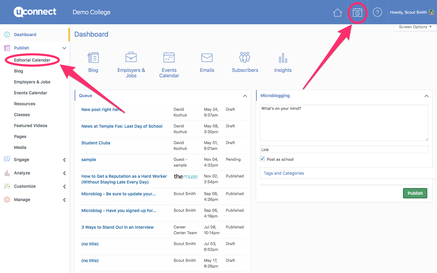 The editorial calendar is a tool that organizes communications across the team and allows you to delegate responsibility, diversify the voice of your career center, brand individual staff members, and encourage community experts to publish content and provide their insights. You don't create content with the editorial calendar, you schedule your team to create content.