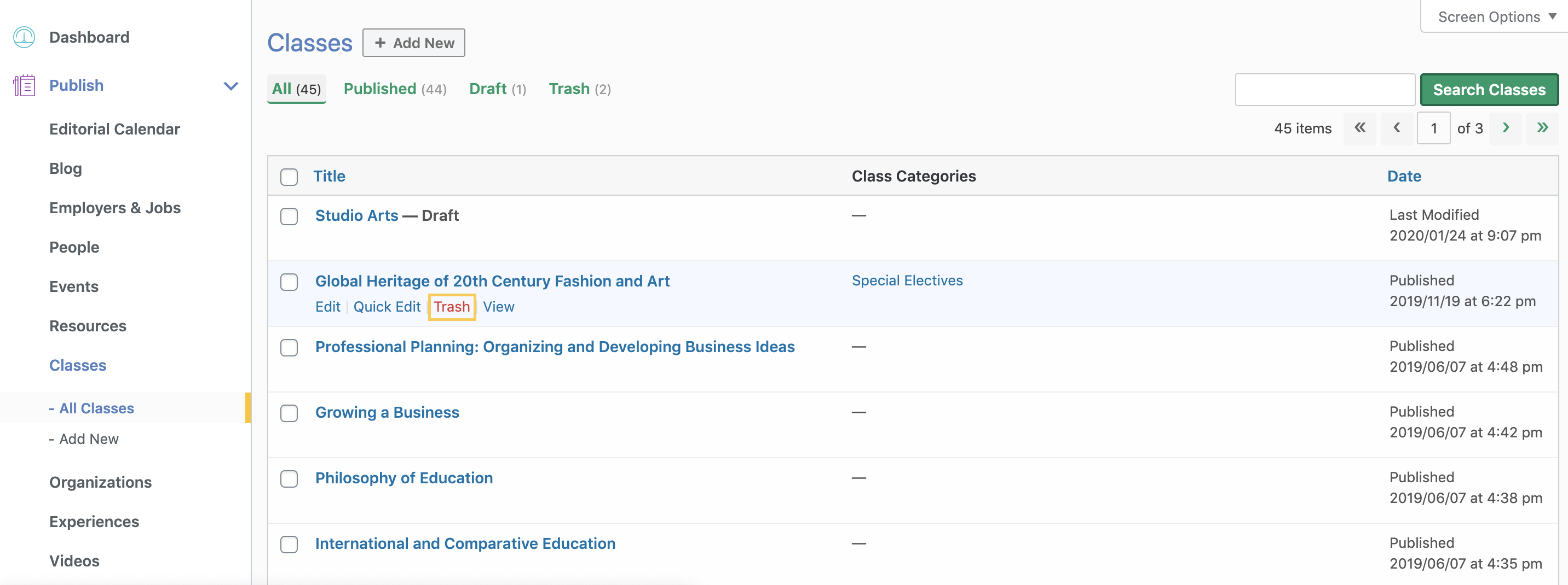 If you'd like to remove a class from your platform, you can do so by 'trashing' it. This will not only remove the class from the front-end, but it will also remove it from the Classes 'All', 'Published', and 'Draft' sections of your dashboard, and push it to the 'Trash' folder.