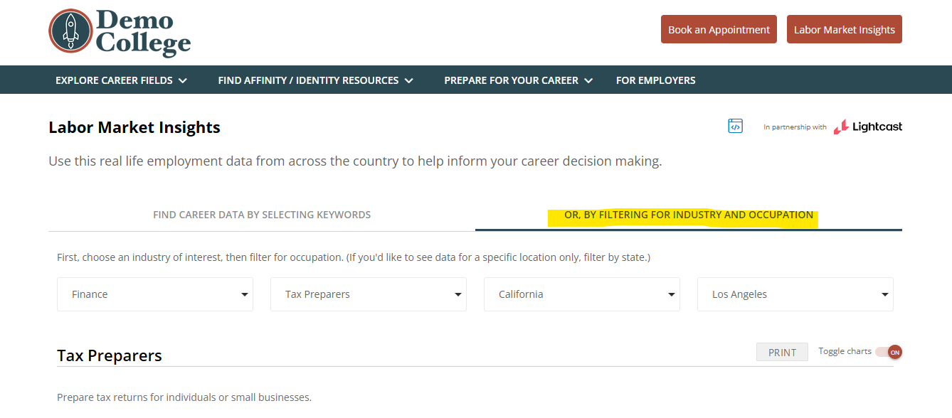 uConnect partnered with Lightcast to put real-time Labor Market Data directly into the hands of your stakeholders. Lightcast continually updates their data to ensure it is the most current, accurate, and comprehensive labor market data out there, so read here to learn more about the scope and frequency of their data. This module allows users to both explore and prepare for a potential career by gaining insight into the context, requirements, and demand for potential occupations within their industry of interest. The Labor Market Insights module can be featured as a standalone page, featured as a widget, if you use the Communities module, and can be embedded on other institutional webpages outside of uConnect (learn more about that here!).
