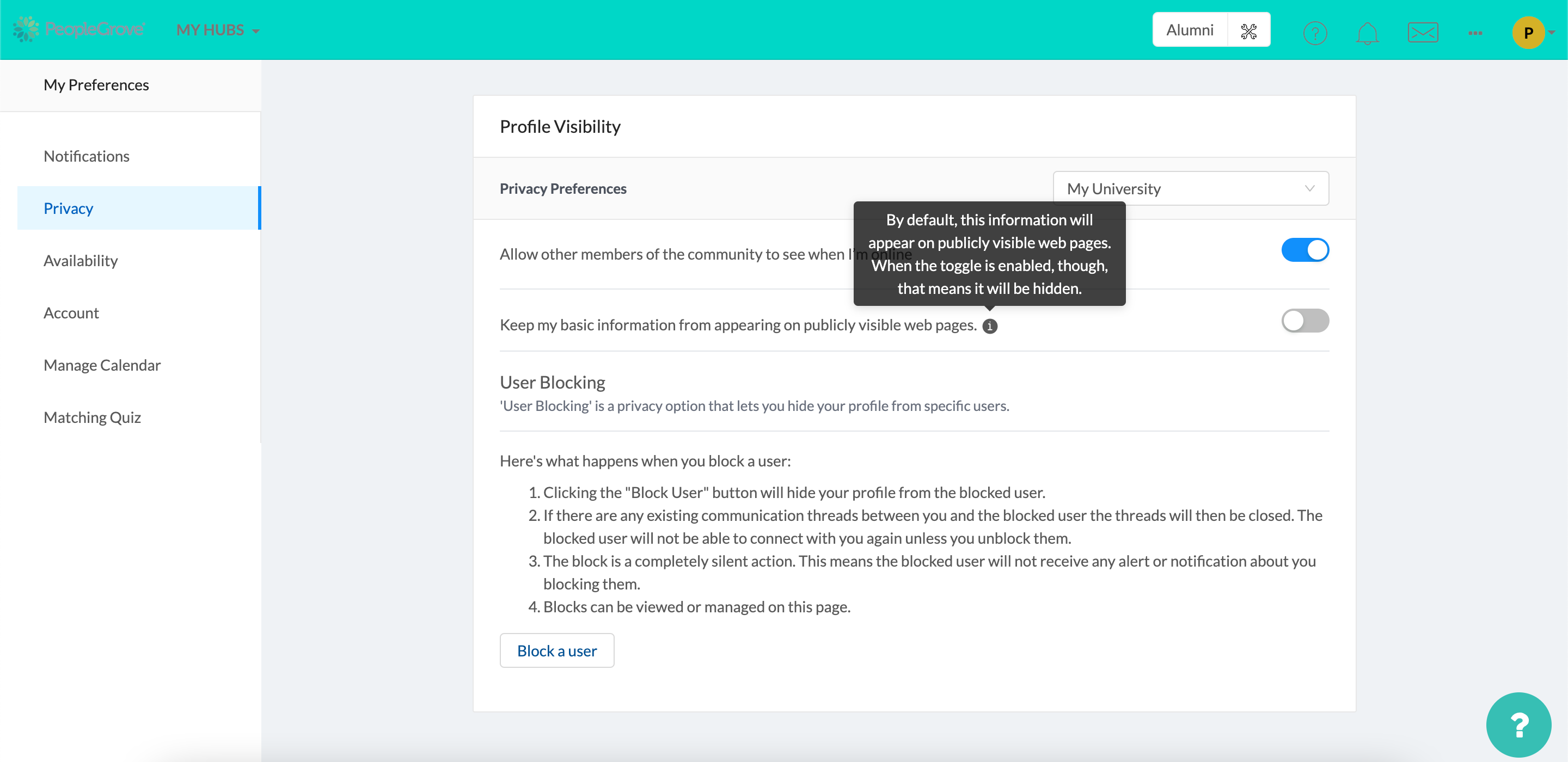 In the Privacy tab of a mentor's profile, they can toggle on an option to 'hide my profile from appearing on any public pages', as seen in the screenshot provided by PeopleGrove, below: