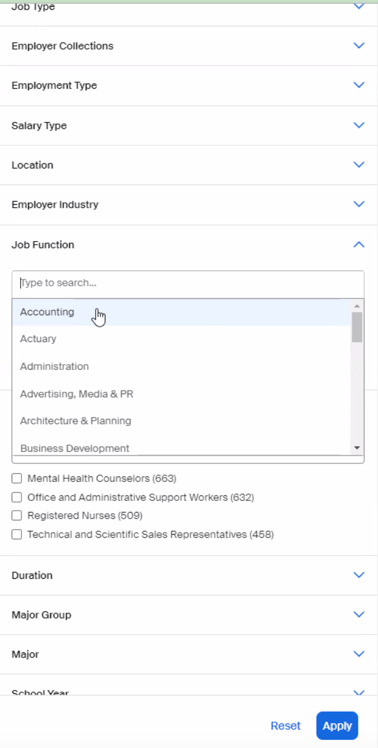 Employer Industry: refines the employers area of industry (see list from Handshake)