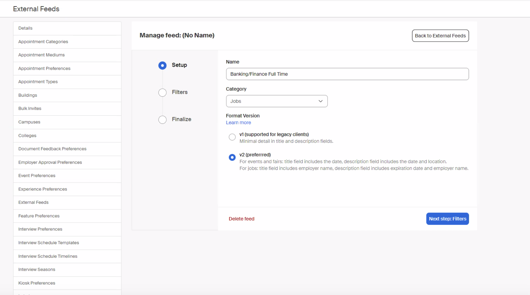 Use the dropdown to determine if you are building a Job (encompasses all opportunities in Handshake), CareerFair, or Event feed.