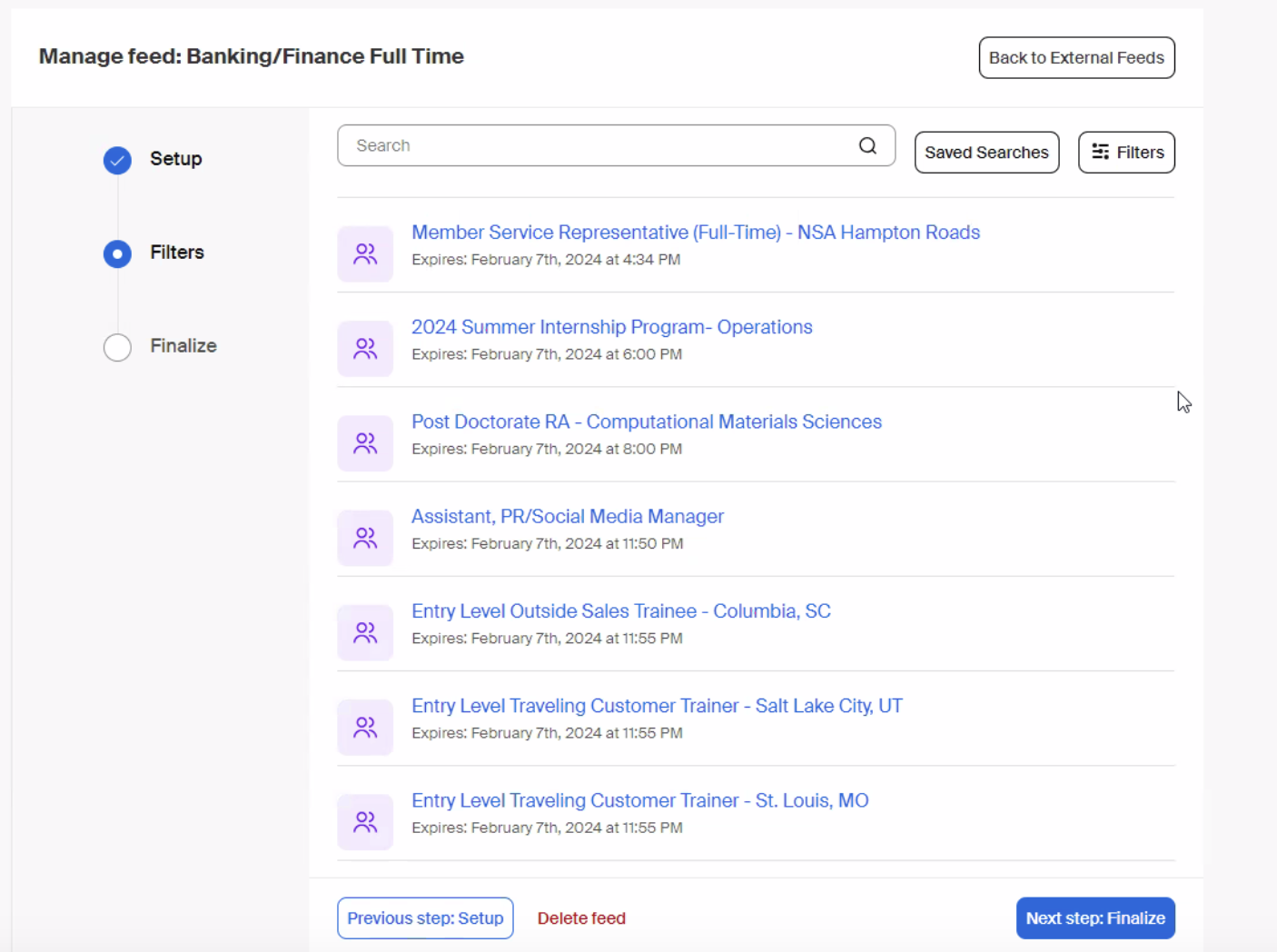 7. Now that you've selected 'Next', select the 'Filters' button on the top right that will allow you to refine the postings that pull into your feed. For example, some of the useful filters that you may want to use are: