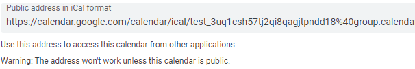 Look for the field labeled “Public Address in iCal format” and please make sure to copy the URL that ends .ics