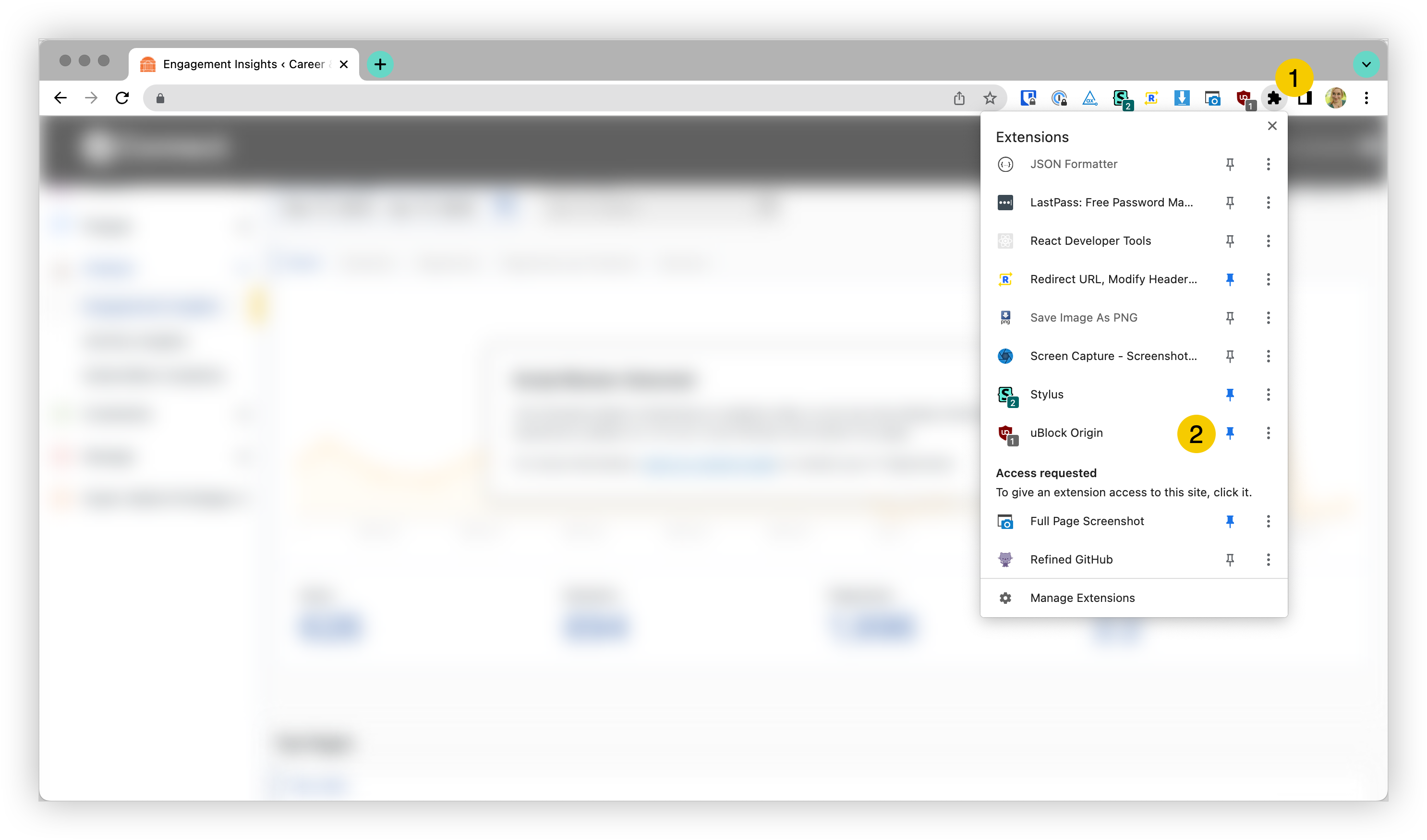 If not, click on the puzzle piece icon to get a full list of your installed extensions. Scroll down to find your script blocker and click on the pin icon to move your blocker into a more prominent, visible location. You can click and drag the icons in your browser bar (near #1 below) to rearrange them.