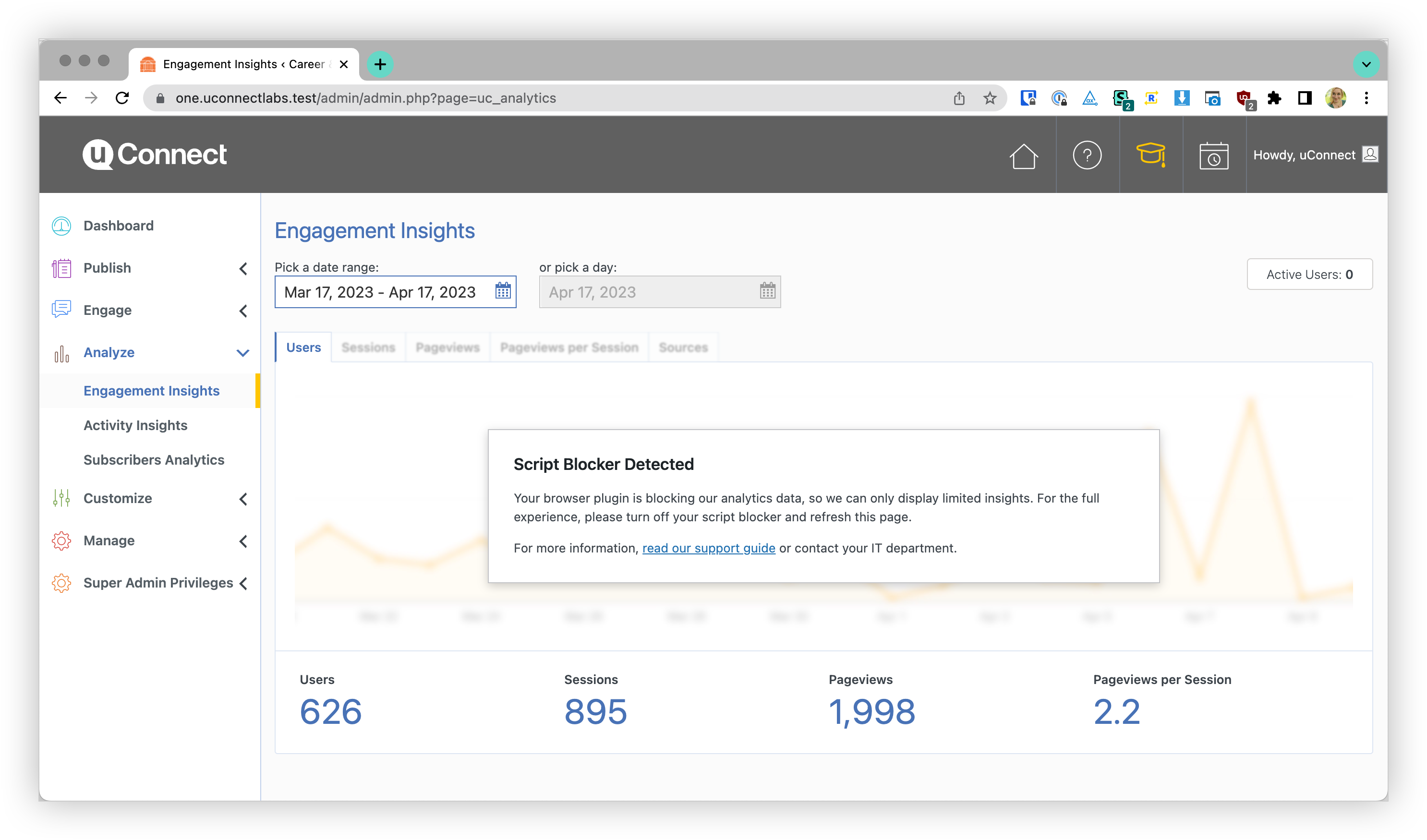 If you've tried to view Engagement Insights or another dashboard page that pulls information from your site analytics and had trouble seeing the charts or data, script blockers could be to blame.