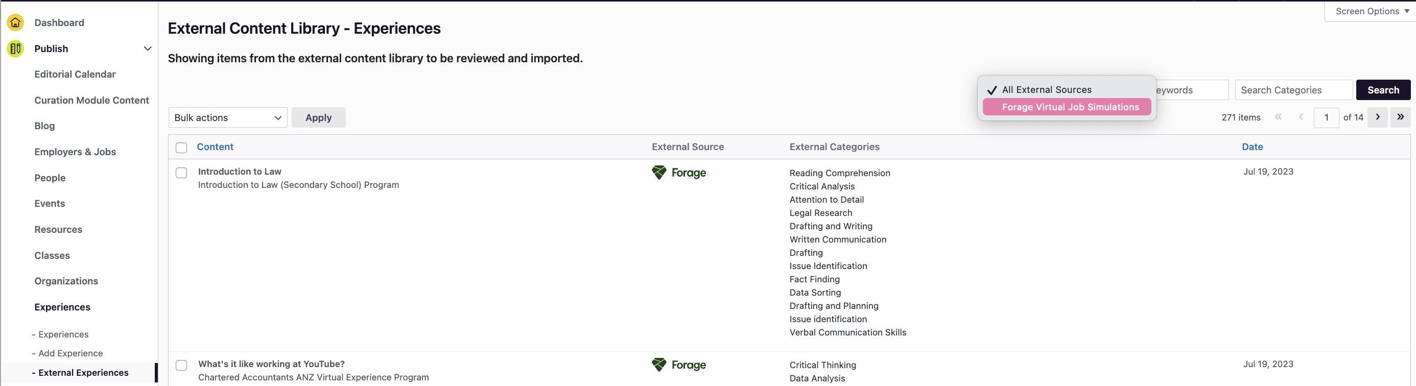 After pressing 'External Content Library', you'll have the option to view all experiences, where you can either use a search bar to look for the name of a particular job simulation or view the entirety of the available experiences.