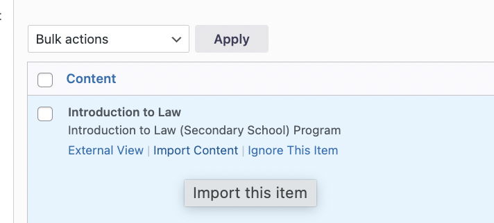 Once ready to publish an experience, hover over the content and click 'Import Content,' as seen below, to bring the experience into your editor view: