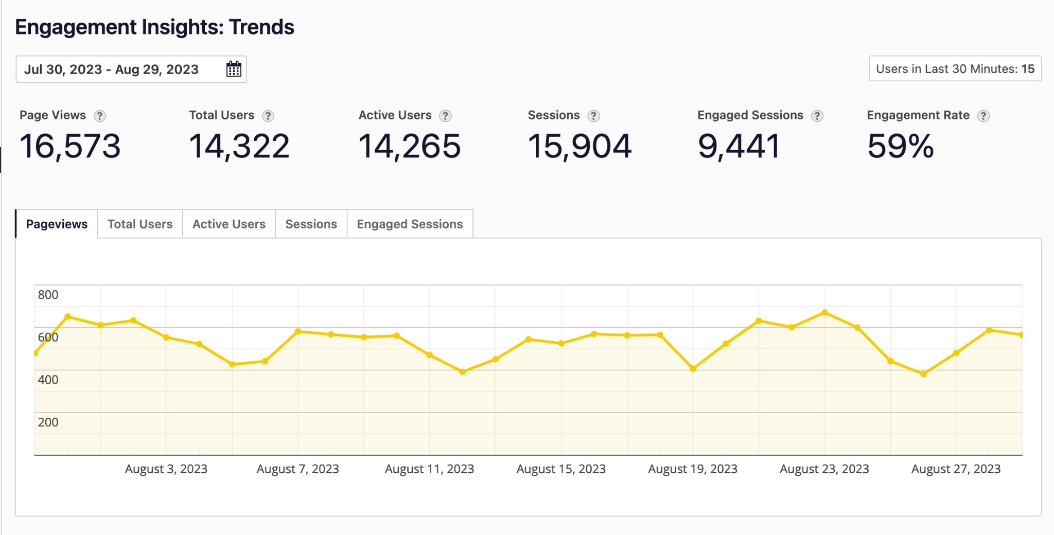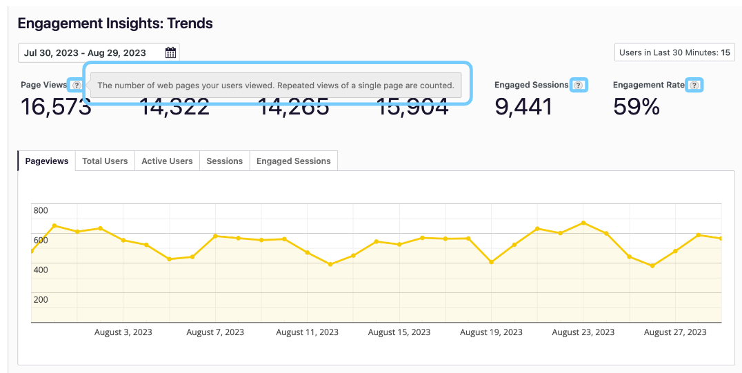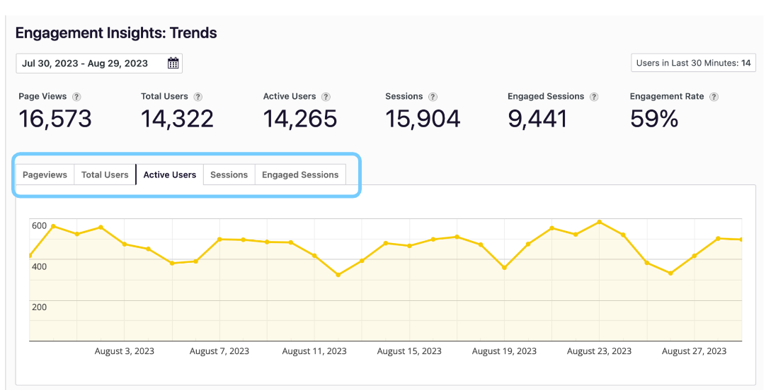 From the dashboard when logged in navigate to Analyze > Engagement Insights > Trends. Here you can set a date range to view analytics including Page Views, Users, Sessions and Engagement Rates.