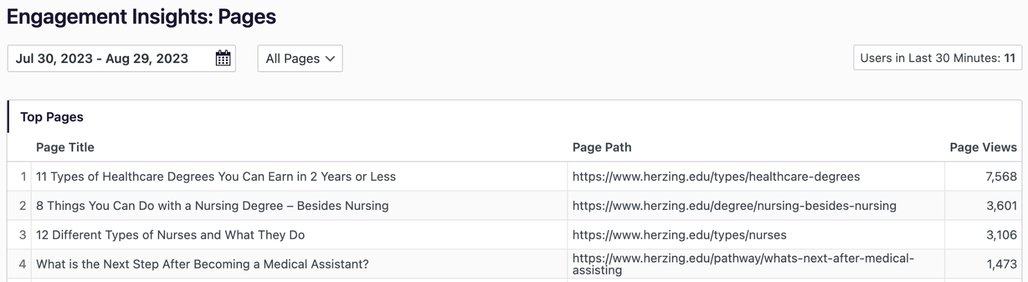 In the same section of the dashboard under Analyze > Engagement Insights > Pages you can also see the top views on all of the institutional pages your Outcome Data Visualization module has been embedded into.