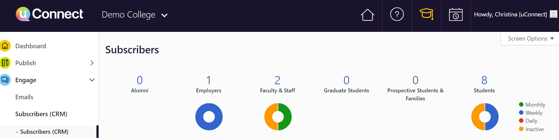 In the case where Single Sign On (SSO) is enabled, when visitors log into their uConnect platform using their institutional credentials, a user account is created for that visitor. When the visitor logs in using their institutional credentials and they don't sign up for alerts or set their preferences, you cannot see them from the admin view in Engage > Subscribers. On the other hand, any visitor who has logged in using SSO AND has signed up for alerts and set their preferences, their accounts will show up under Engage > Subscribers.
