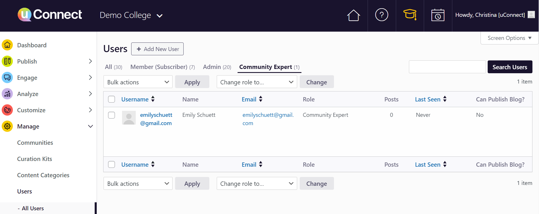 In general, Users are the accounts created for yourself and anyone contributing content to your platform and of whom has backend access. Conversely, Subscribers are the accounts of individuals that you want to receive your uConnect emails and these accounts store the subscriber preferences (or tags) of those individuals so you know who should receive certain content (example: if a subscriber signed up to receive information about your Accounting career community, you could email anyone with that corresponding career community tag and send them information). Let's dive in deeper.