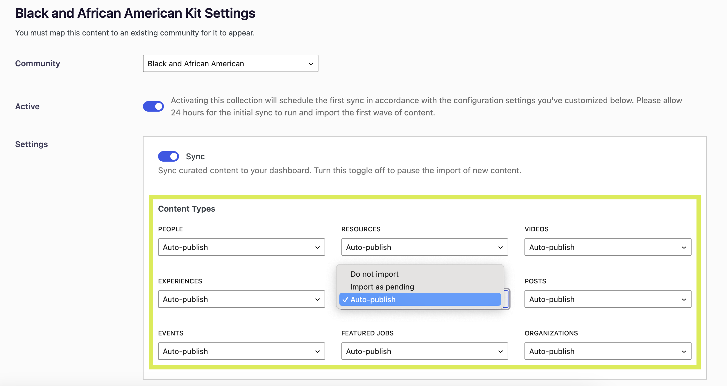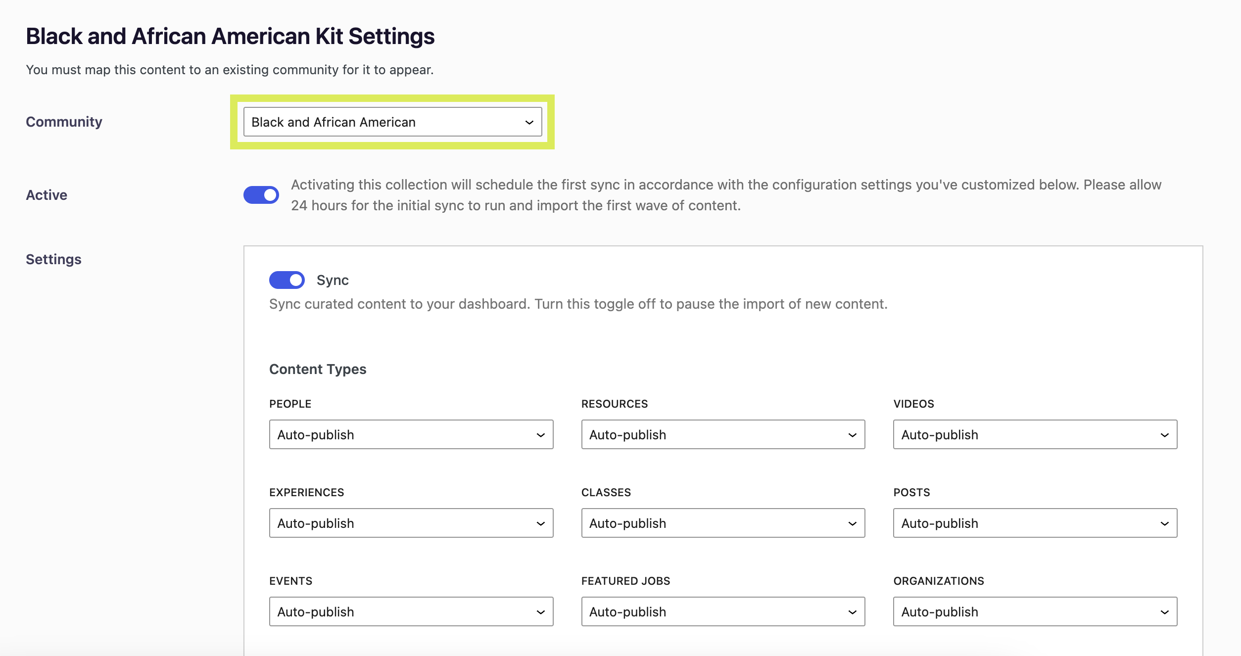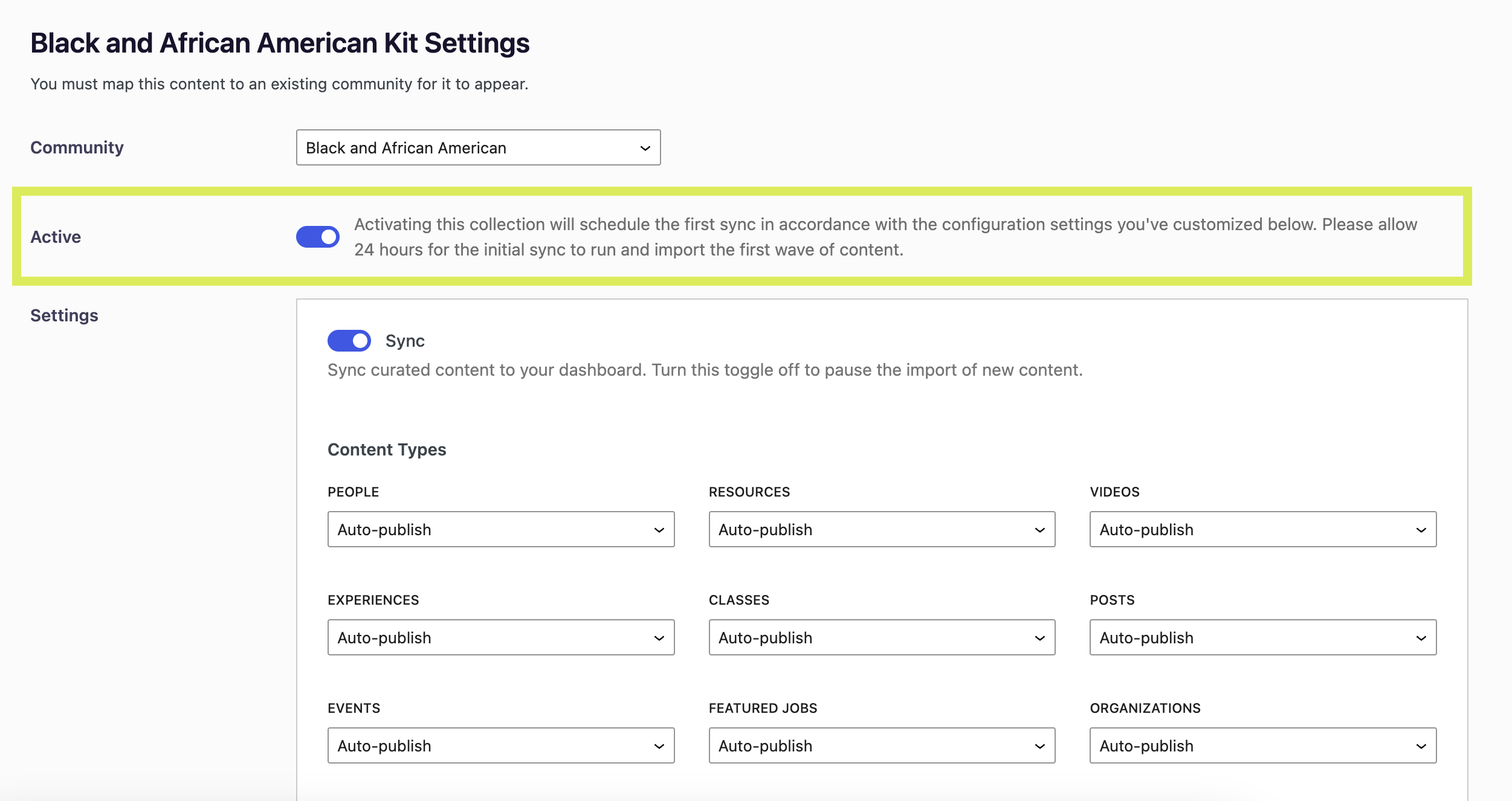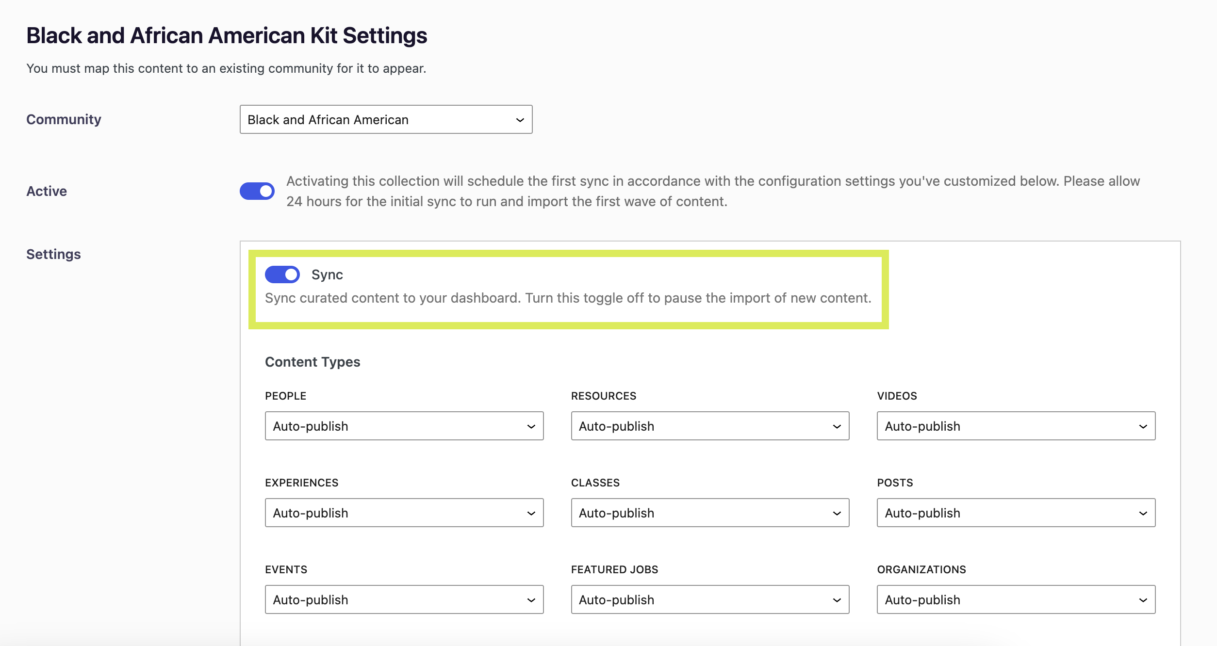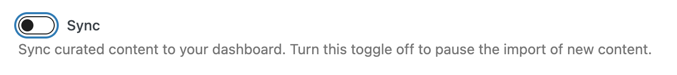 Under the Settings section, you'll be prompted to turn on the Sync toggle. This will tell the system to sync kit content into the dashboard. In the future if you ever want to pause the import of any new content in this kit (but still maintain any content the kit has already imported), you can turn this off to pause the kit. It takes 24 hours for the content of the kit to populate into your uConnect platform.