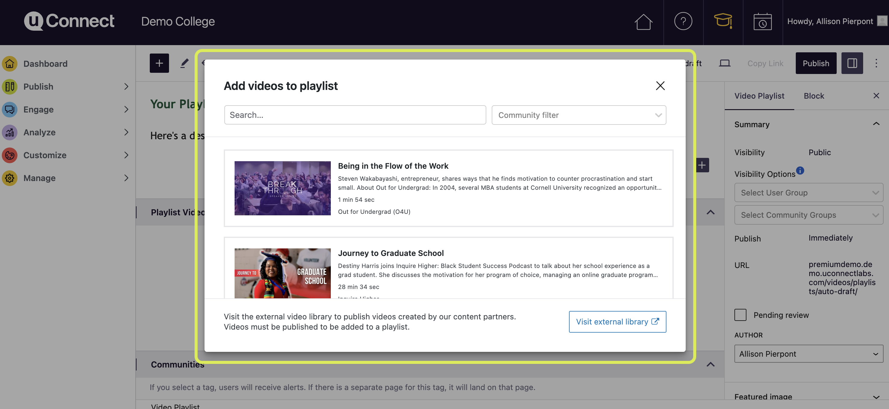 This will open a pop up screen where you can multi-select any published videos from your platform to be included in your playlist. You can use search to find the specific videos you're looking for, or filter by community tags to make locating the right videos easy.