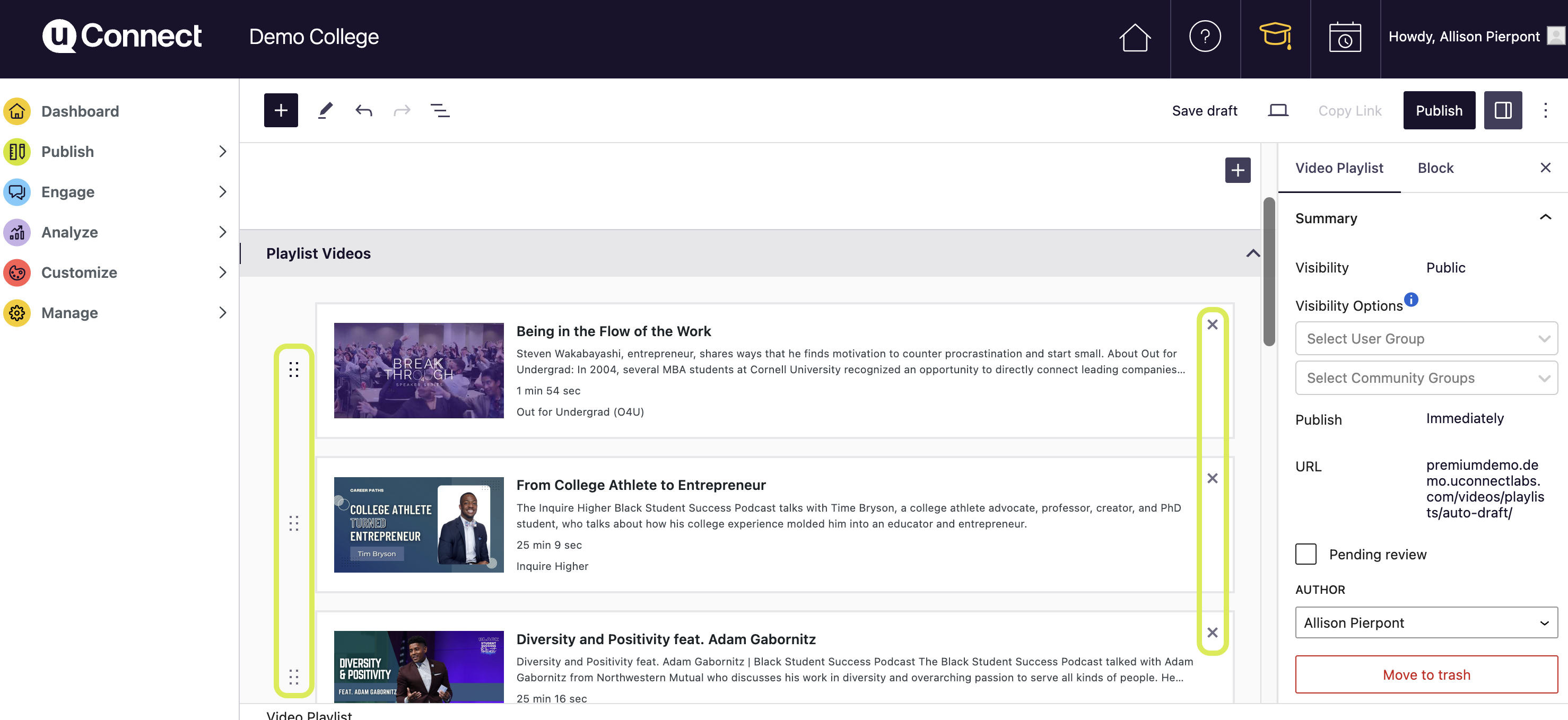 Once you've selected your videos, you can drag and drop to reorder them, delete any you no longer want, or pop the window back open to add in more. You can open any previously published playlist to make these changes as well!