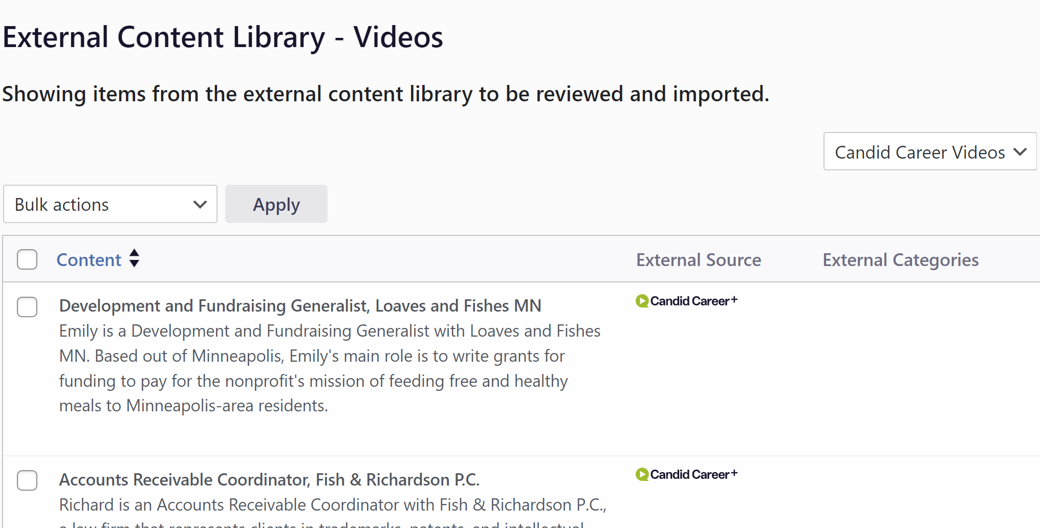 To embed a Candid Career+ video, navigate to Publish > Videos, from your dashboard. Once there, you can either search for an existing Candid Career+ video that you know that you'd like to embed, or select External Videos and then filter by 'Candid Career+ Videos' in the provider dropdown list to view all Candid Career+ video content.