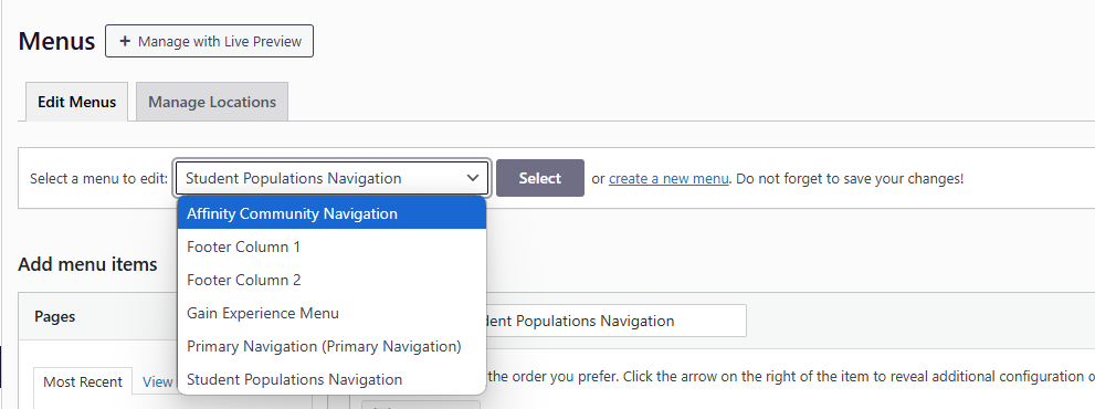 From there, you will want to click on the menu dropdown bar to choose which menu you want to edit and then hitting "Select" to begin editing.