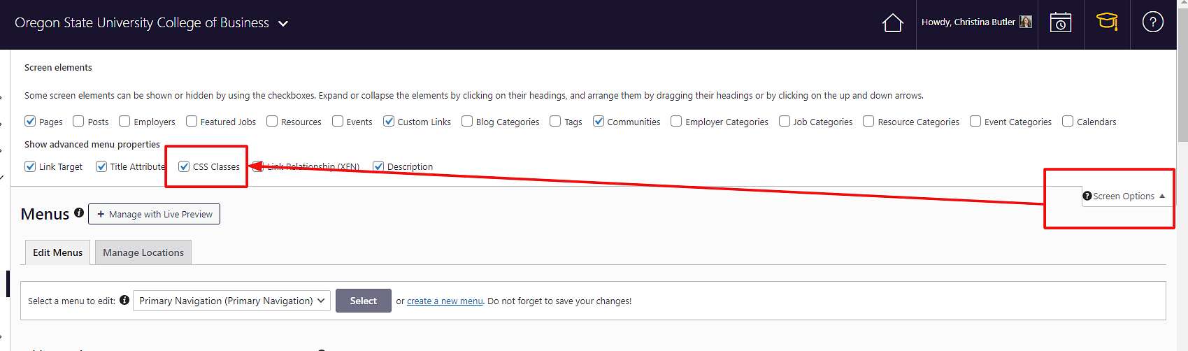 Looking to customize your menu items just a bit further? While, by default, your menus will be branded to match your institutional branding and web accessibility standards, there are a few additional options that you will have, as detailed below. Remember, to update your menus, you will need to be in the Customize > Menus area of your dashboard, and you will need to select the given menu that you would like to make changes to from the menu dropdown!