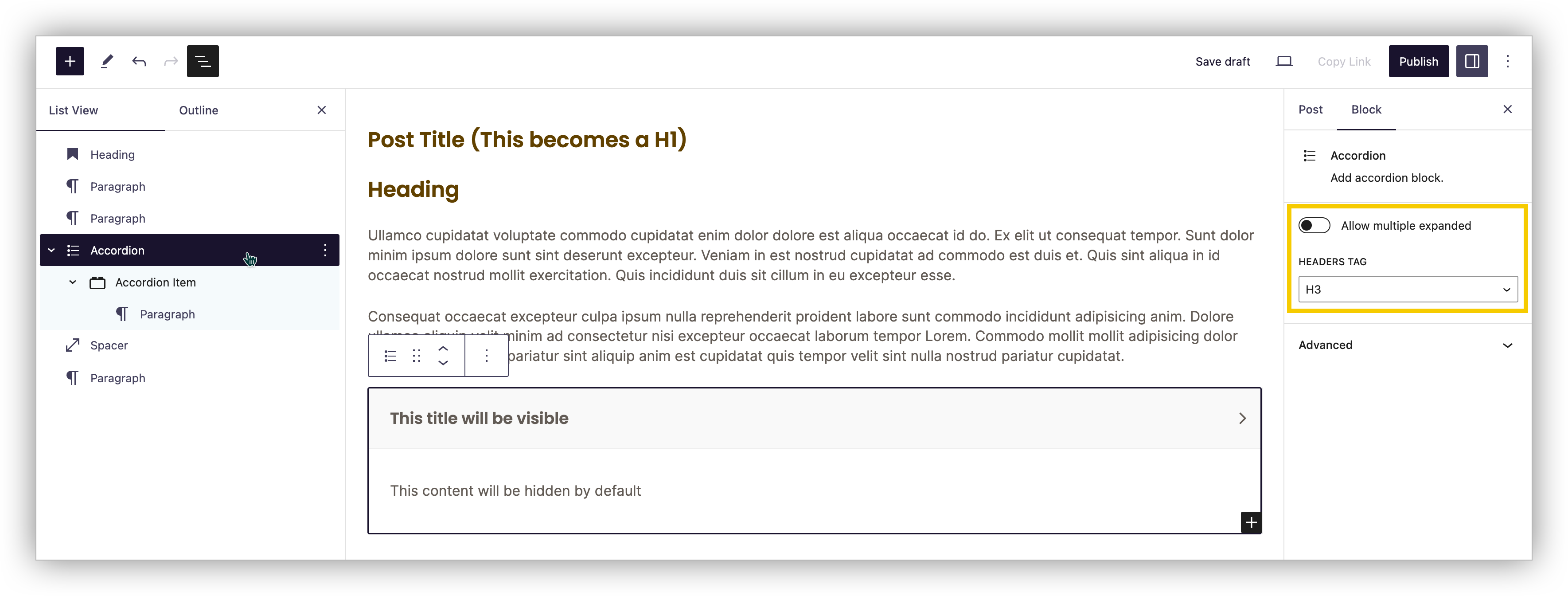 When you select the Accordion or Accordion Item block, you have the option to change the heading tag used for your accordion. Make sure to follow the correct order based on its placement on your page.
