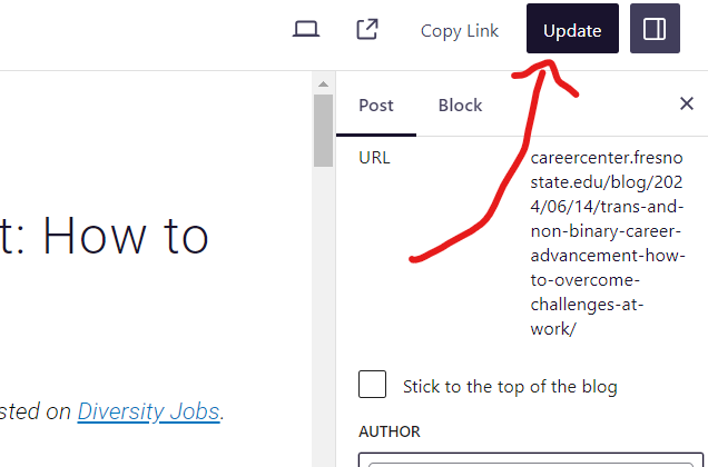If you are updating an existing blog post’s author, be sure to select “Update” to save your changes.